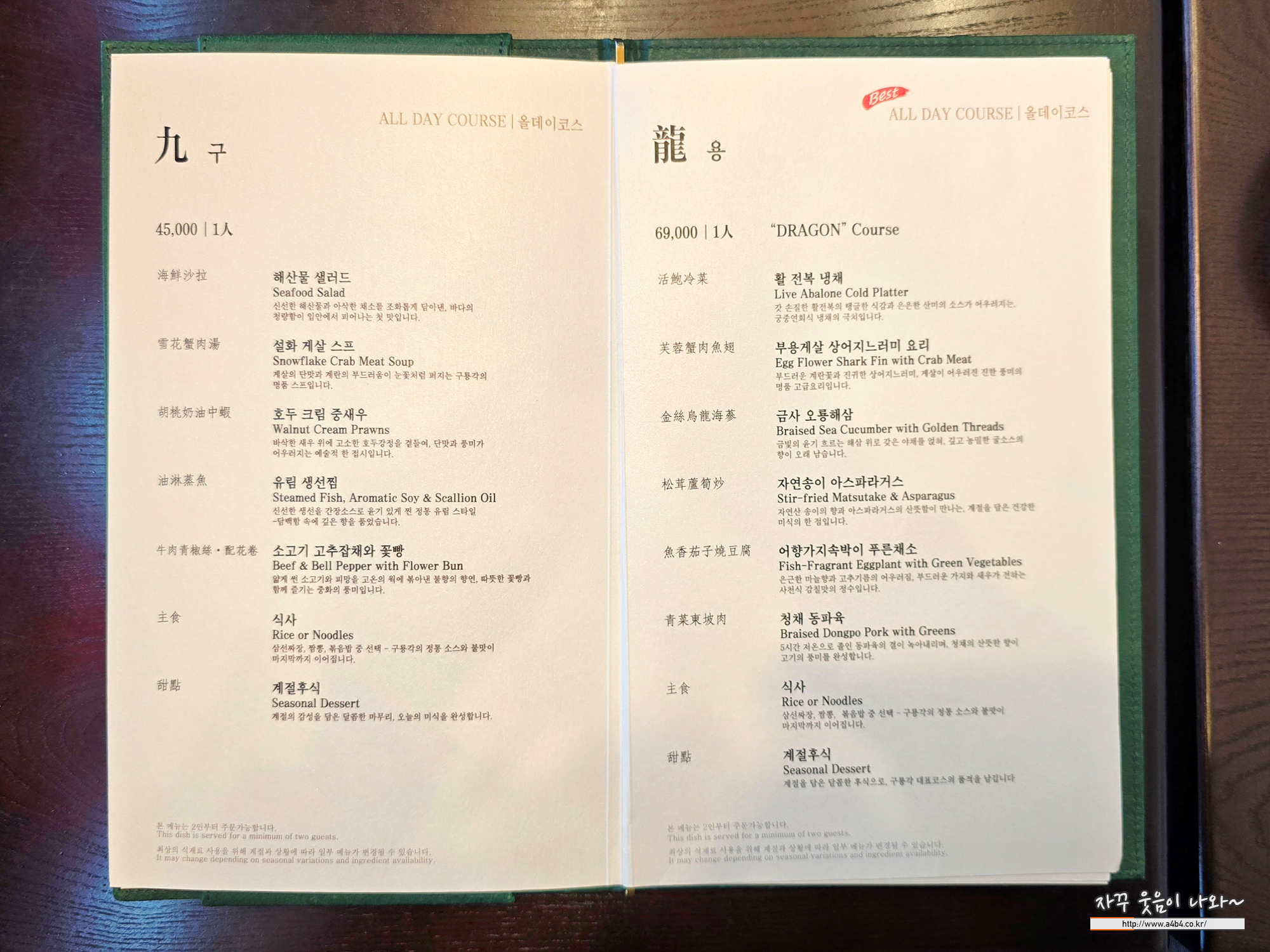 구룡각 코스요리는 총 3가지 종류가 있고요. 구(九) 코스(45,000원/人) 룡(龍) 코스(69,000원/人) 각(閣) 코스(95,000원/人) 선택할 수 있습니다.