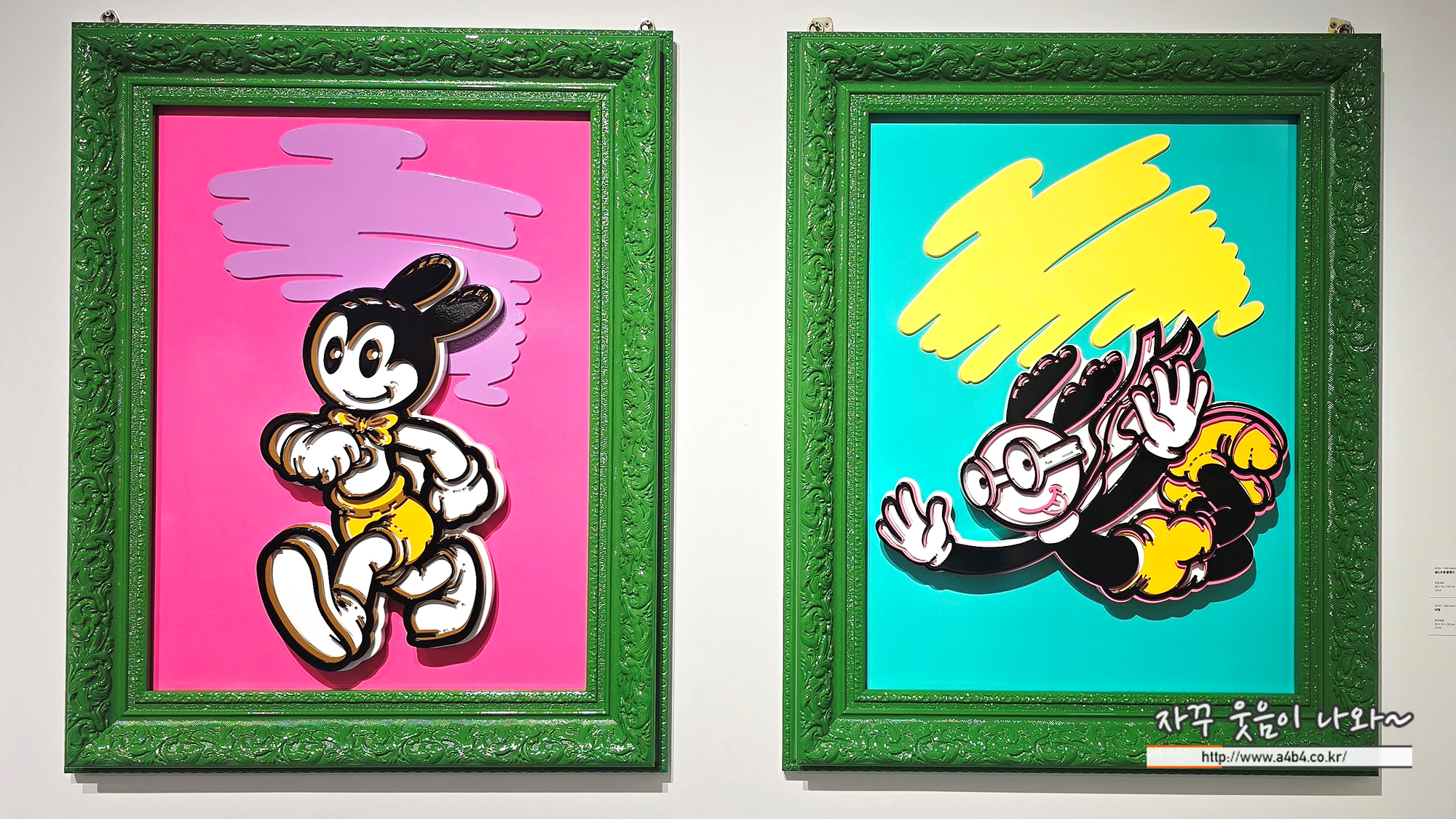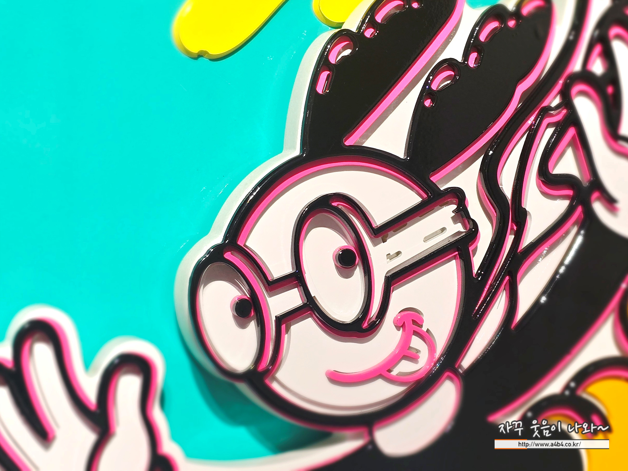 밝은 핑크 배경 위에 유쾌하게 걷는 토끼 형상의 인물이 등장합니다. 김대성 작가는 ‘피터팬의 그림자’를 모티프로, 동심과 상상 속 존재가 가진 자유로움을 팝아트적 감성으로 표현합니다. 검은 윤곽선과 강렬한 색채의 대비는 현실과 환상의 경계를 상징하며, 쉐도우맨은 잃어버린 꿈과 순수함을 찾아가는 작가의 상징적 자아로 자리 잡습니다.