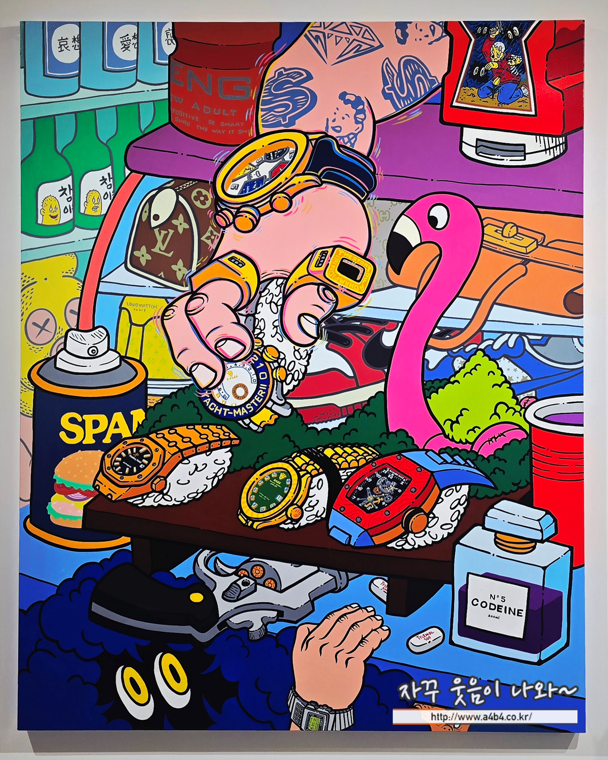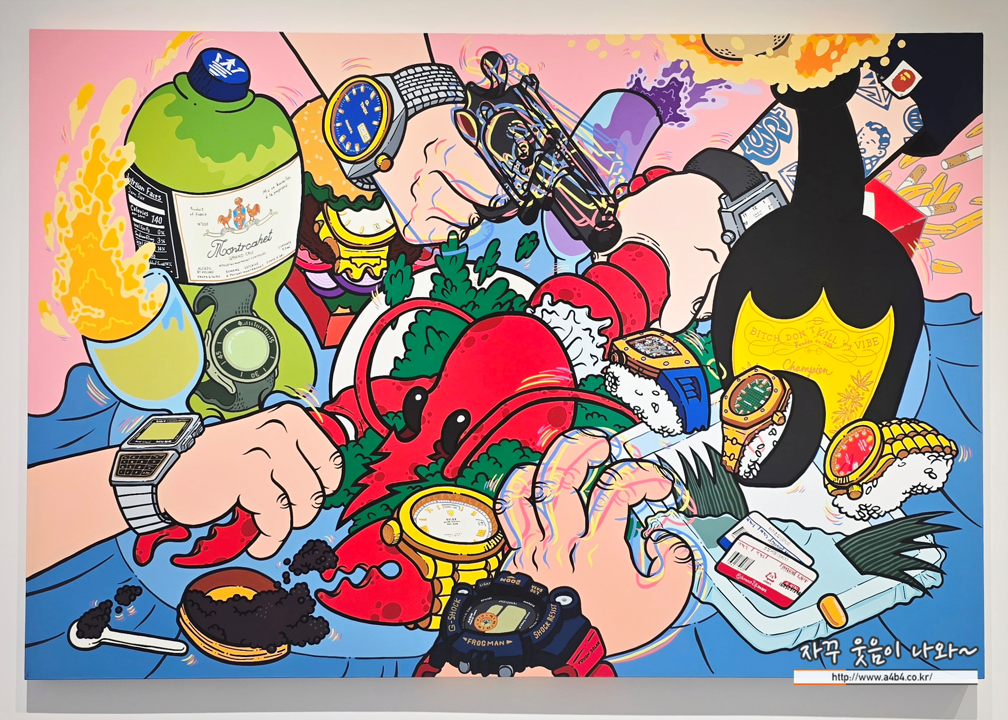 유용선은 강렬한 색의 대비와 캐릭터적 이미지를 통해 현대 도시의 욕망 구조를 해부합니다. 광고, 브랜드, 인터넷 밈 같은 시각적 언어를 회화 속에 재조립하며, 익숙한 이미지가 낯설게 변주되는 순간을 포착합니다. 그의 작품은 소비와 유희, 유머와 불안을 동시에 품고 있으며, 욕망과 쾌락을 재료로 프레임 안에서 하나의 요리를 차려냅니다. 그 안에서 색은 다수의 오브제를 질서 있게 묶어 긴장과 균형을 조율합니다.