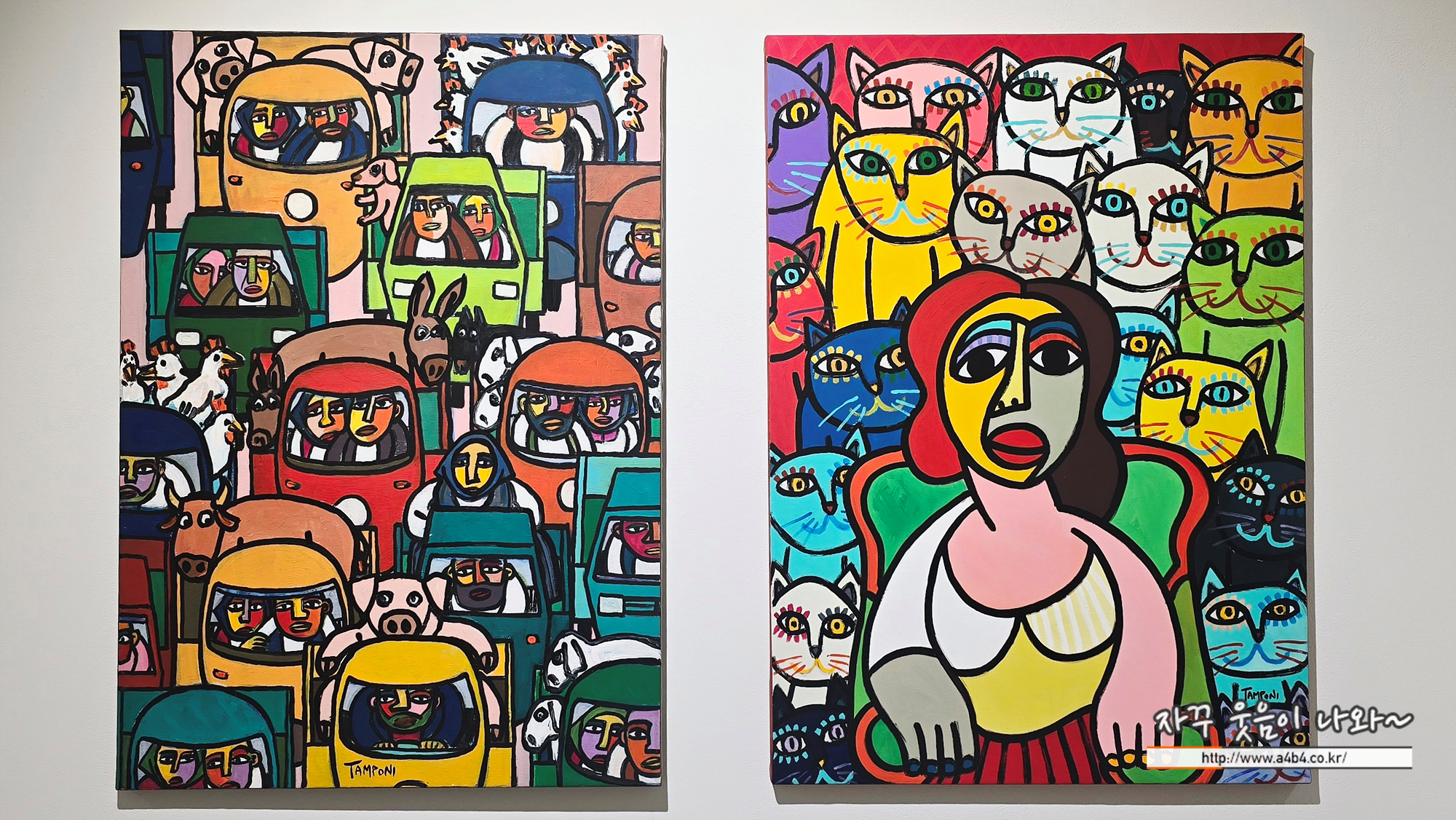 빠름과 느림, 인간의 시간과 동물의 시간이 색의 대비 속에서 충돌하고, 만화적 단순화와 큐비즘적 분할, 규칙적인 반복을 통해 개별 표정은 군집의 리듬으로 바뀝니다. 비비드한 팔레트는 공감과 풍자를 동시에 밀어 올립니다