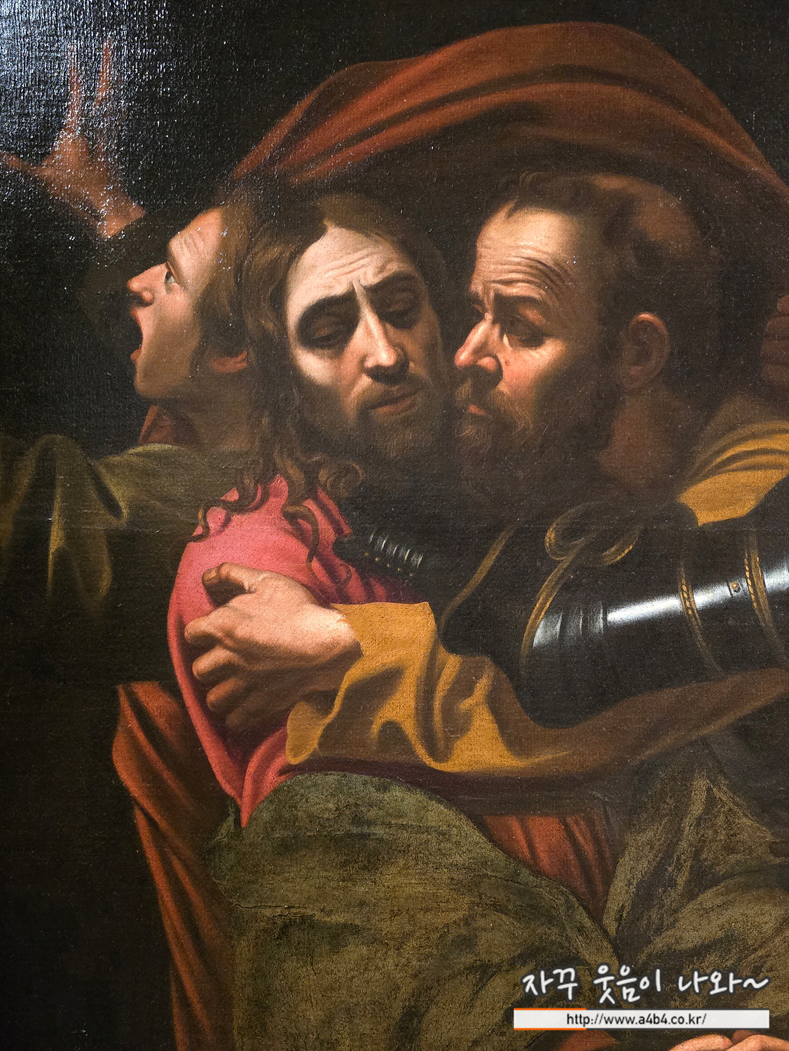 화면 왼쪽에서 입을 크게 벌리고 고통스러워하는 인물은 성 요한 복음사가입니다. 화면 오른쪽 상단에서 등불을 들고 체포 장면을 바라보는 인물이 성서에 등장하는 말쿠스일 가능성이 높습니다. 이 인물은 카라바조의 자화상으로 추정됩니다. 최근 복원 작업을 통해 덧칠한 부분이 제거되면서 이 자화상의 증거가 다시 드러났습니다.