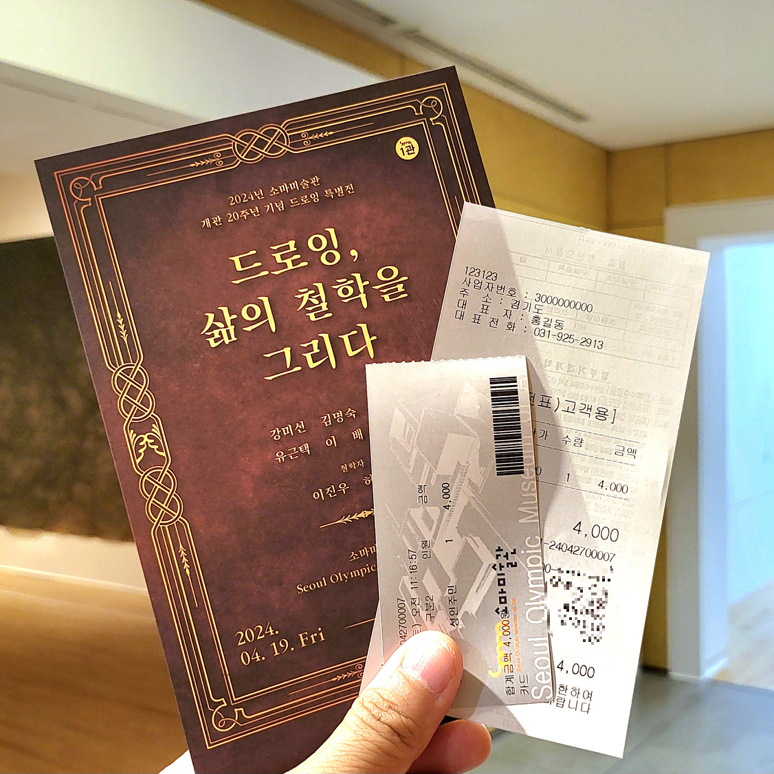 '드로잉, 삶의 철학을 그리다' 전시회 관람료는 성인(만25-64세) 5,000원, 청소년(만13-24세) 4,000원, 어린이(만7-12세) 3,000원 입니다. 전시회 할인은 서울 송파구와 강동구 주민의 경우 신분증 등 증빙서류를 제출하면 20% 할인된 4,000원에 관람이 가능합니다. 또한 소마미술관 1관과 2관 전시티켓을 한 번에 구매하면 10,000원 > 8,000원에 구입이 가능합니다.