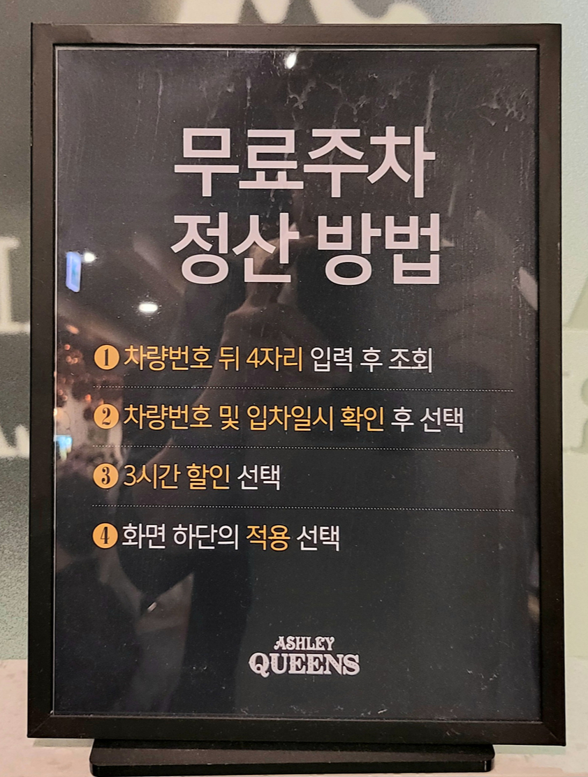 애슐리퀸즈 잠실롯데캐슬점 주차요금은 3시간 까지 무료 주차가 지원됩니다. 식사를 마치고 카운터 옆의 태블릿에서 직접 주차처리하시면 됩니다. 위 캐슬플라자 주차할인 정책과 상관없이 애슐리 잠실 방문객은 3시간 주차할인 지원됩니다.