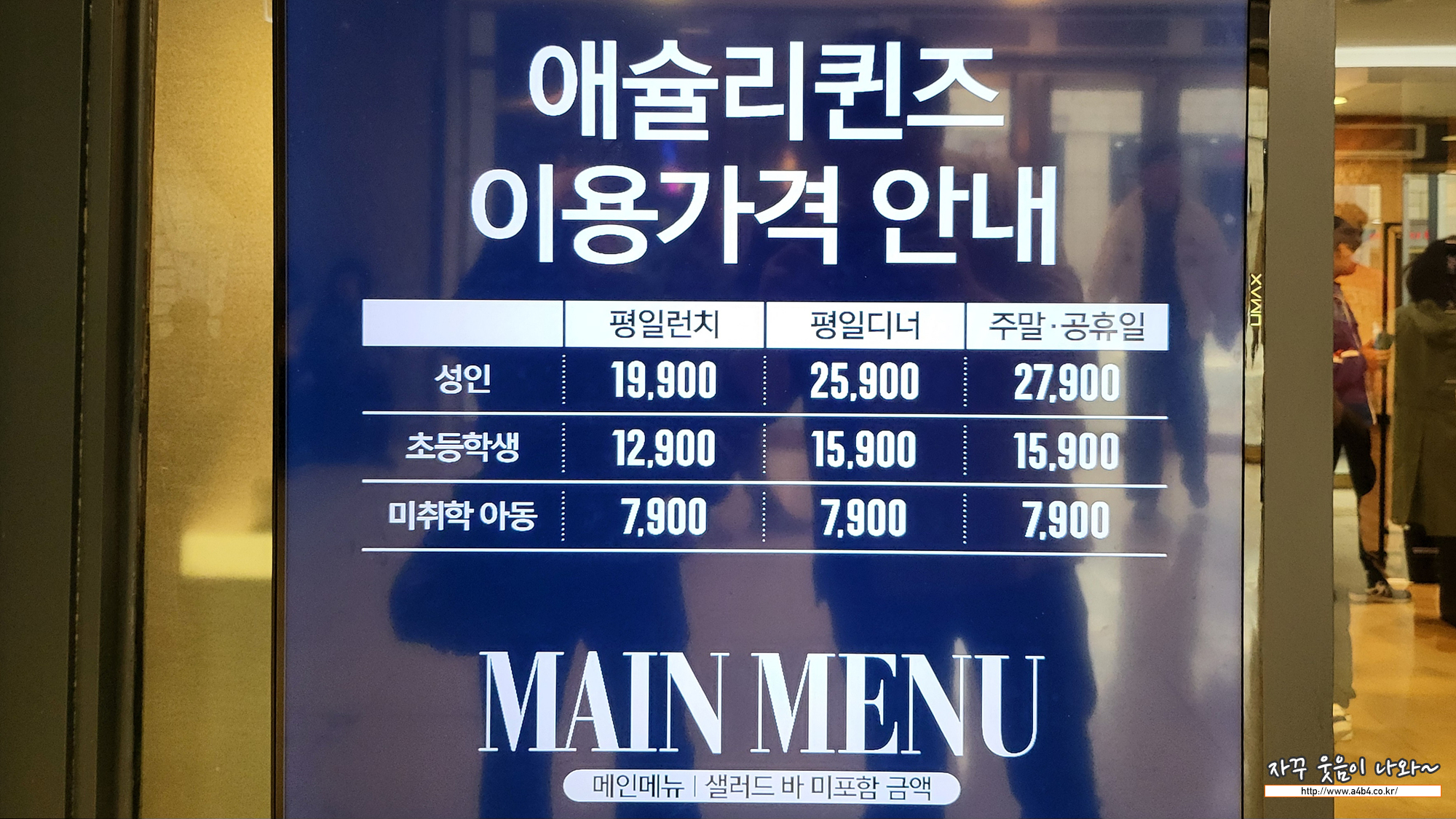 애슐리퀸즈 잠실롯데캐슬점 예약, 가격, 주차 소개를 끝내고, 본격적으로 실내 및 메뉴소개 진행합니다.