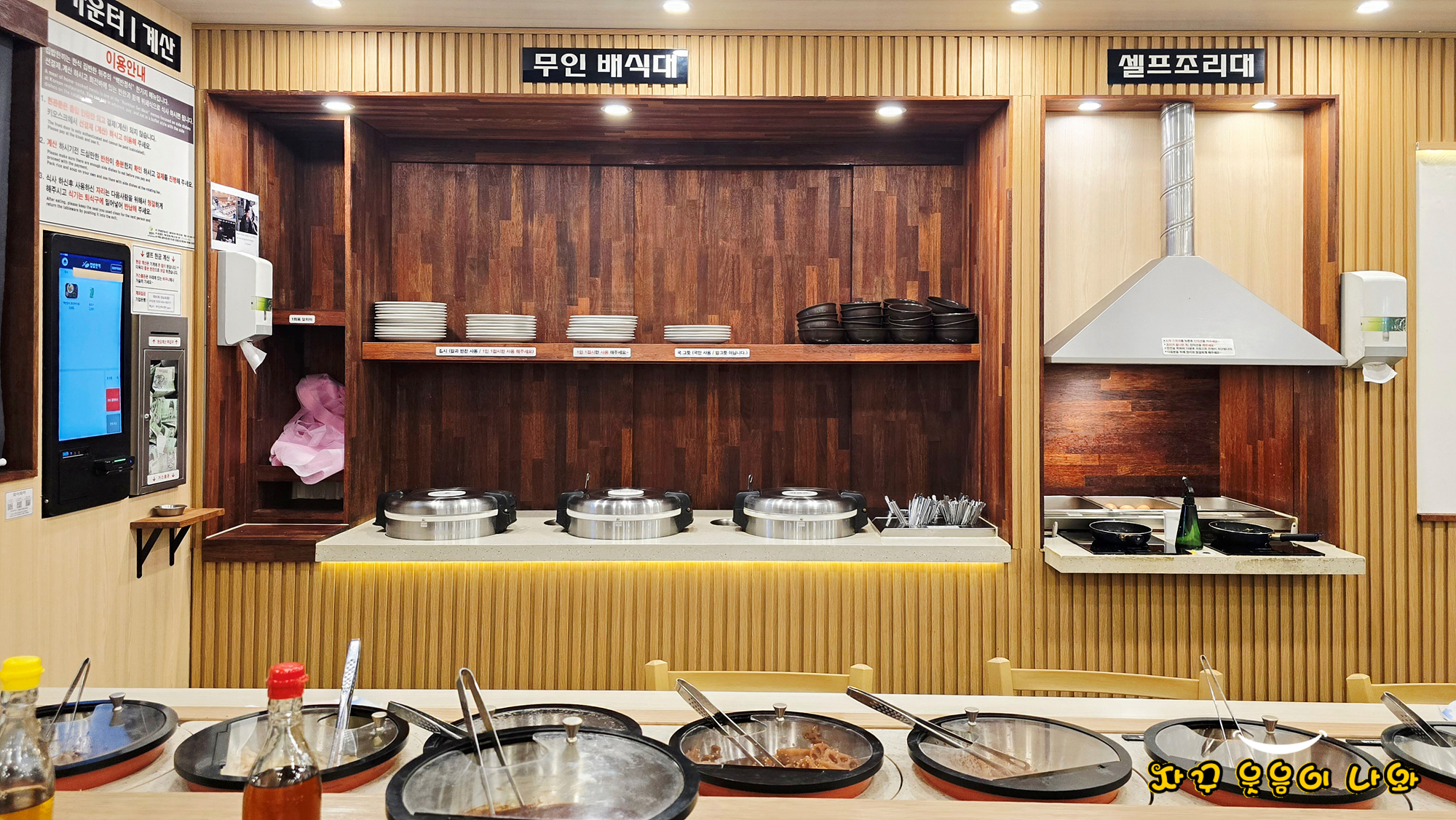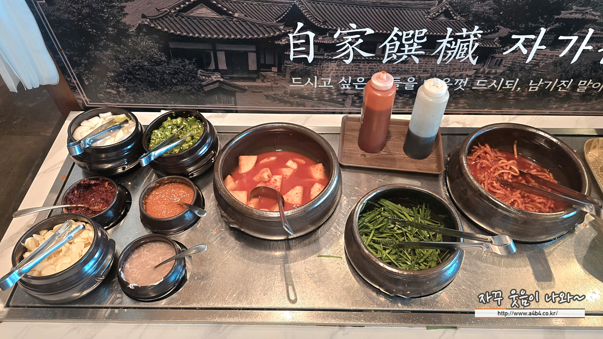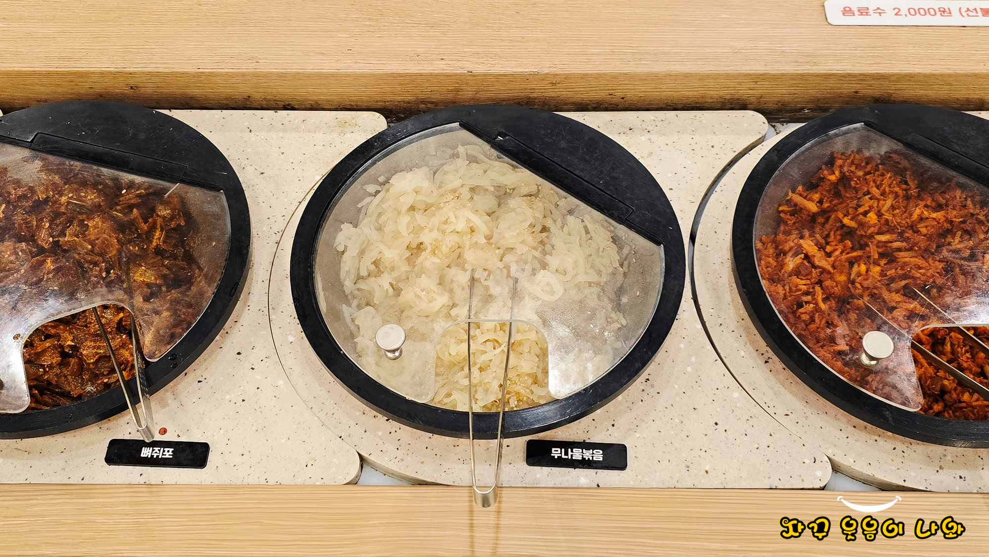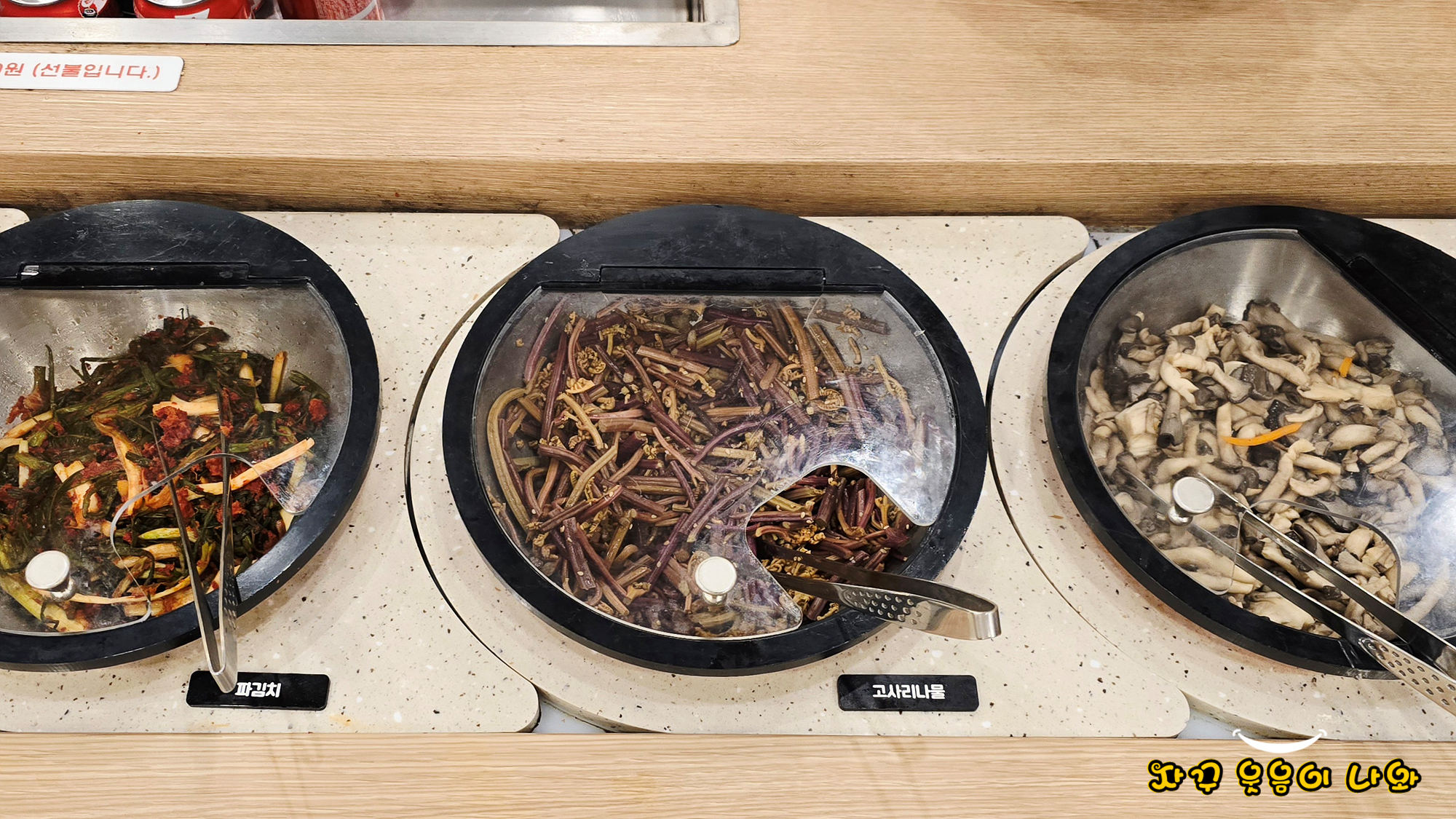 기본 반찬은 무나물과 석박지, 부추와 소스가 세팅되고요. 추가 리필은 셀프입니다. 또한 셀프코너에는 마늘 슬라이스와 양파. 청양고추 등이 추가로 세팅되어 있습니다.