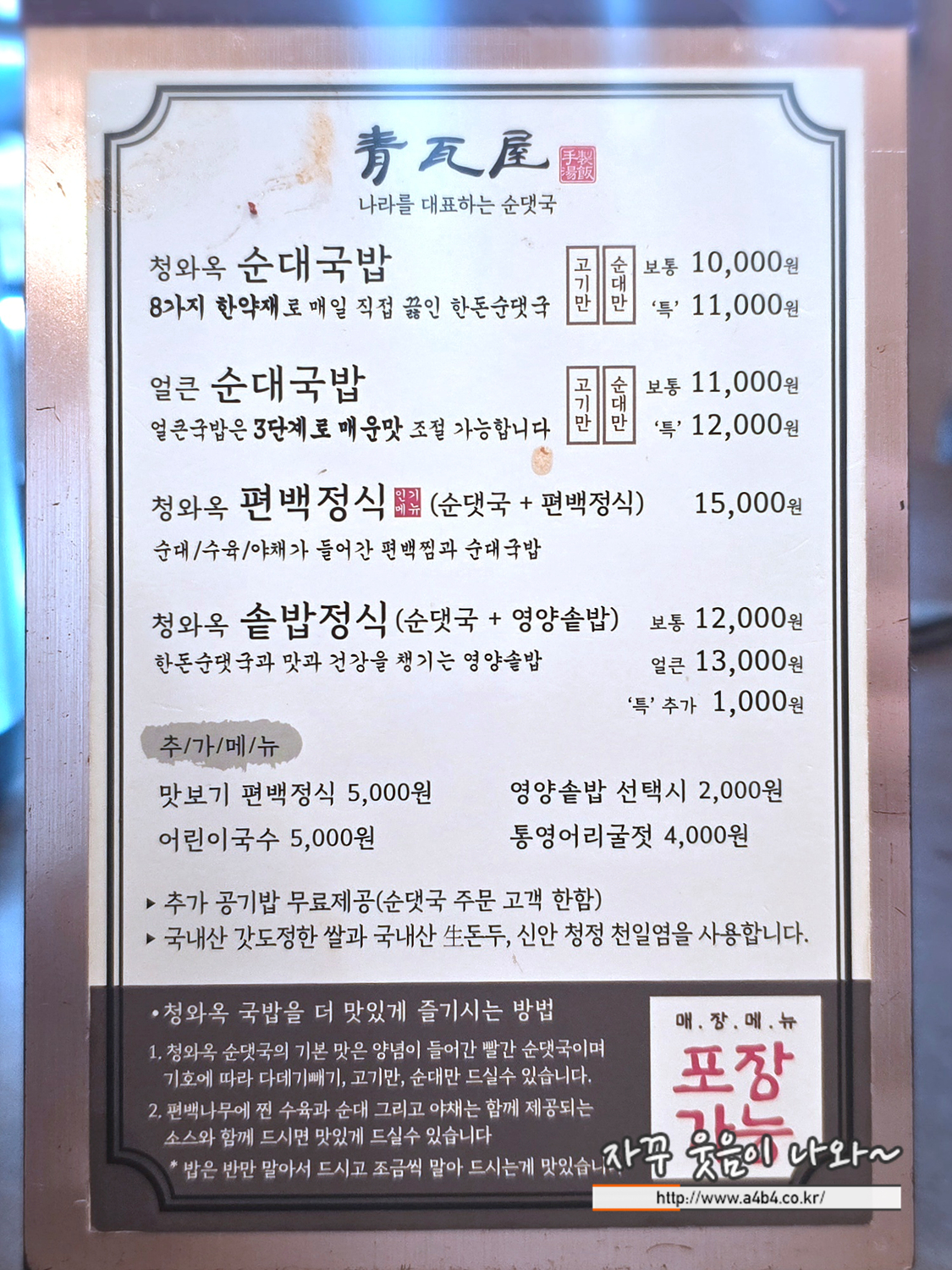 | 청와옥 메뉴 및 가격