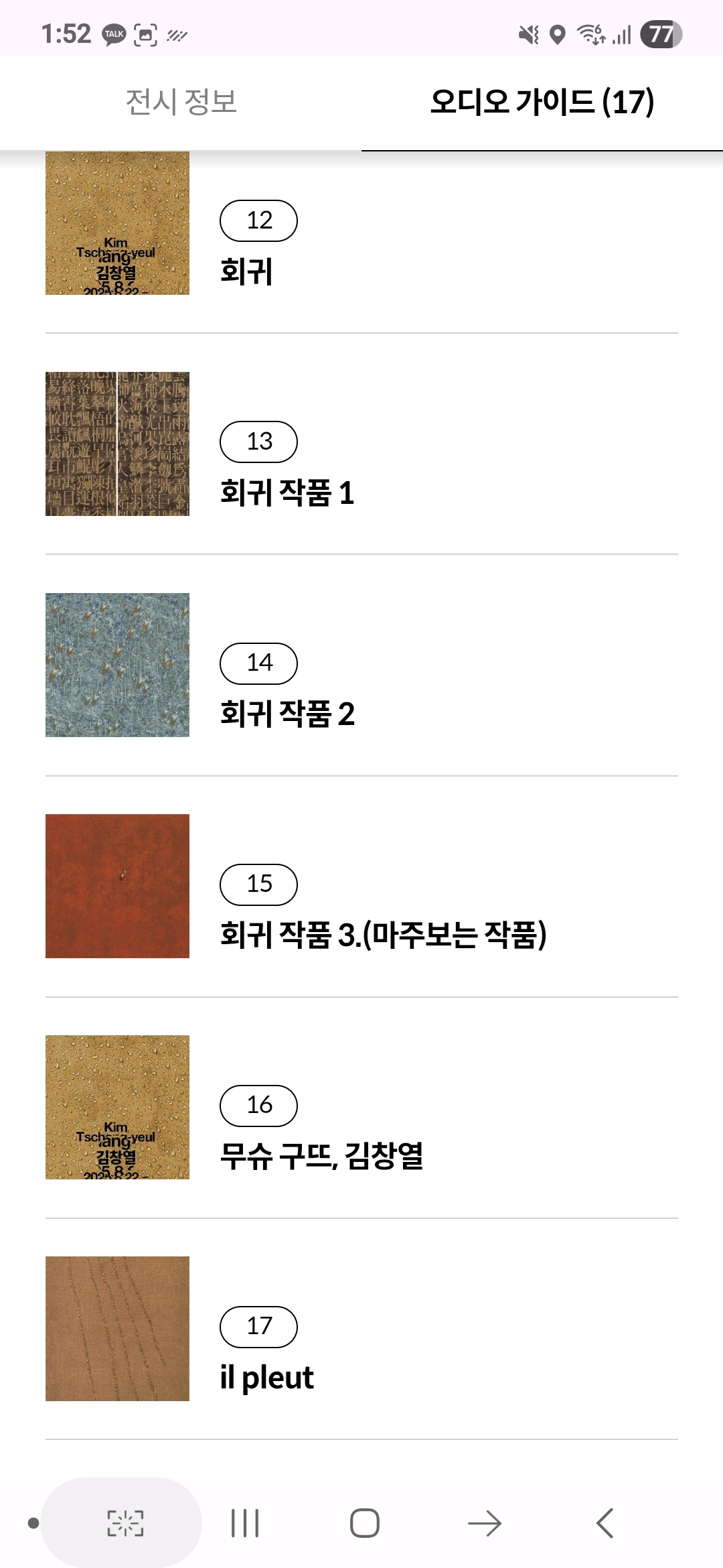 다만 국립현대미술관 앱에서 김창열 전시회 오디오가이드는 무료로 이용이 가능합니다. 총 17개 클립으로 내용은 충실합니다. 오디오가이드 청취 위한 이어폰 챙기세요.