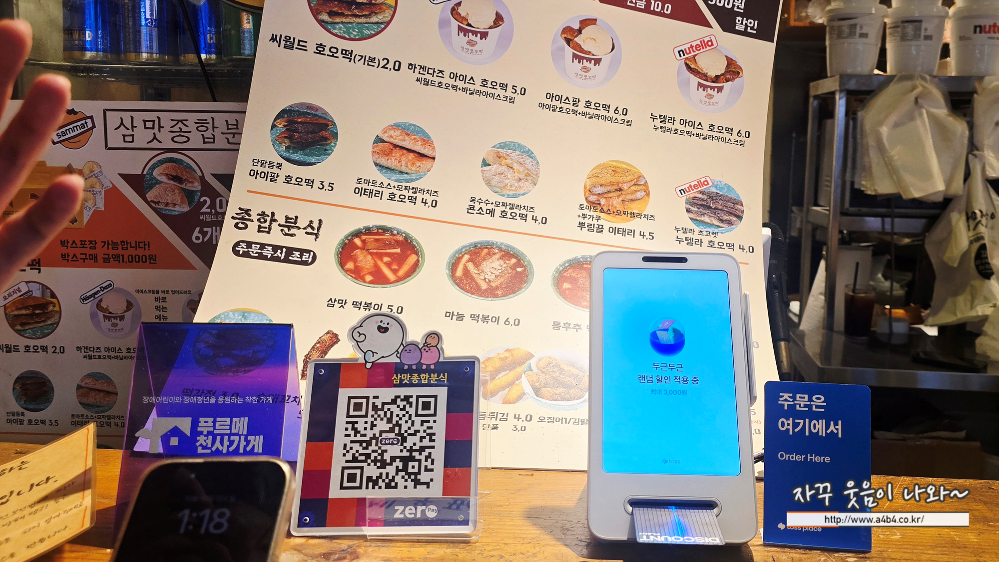 삼맛호오떡 메뉴는 다른곳에서는 만나볼 수 없는 다양한 종류의 호떡들과 아이스크림호오떡, 떡볶이, 튀김 등을 만나볼 수 있습니다. 매장안에서 키오스크나 직접 주문하시면 되고요. 주문 후 밖에서 번호불러 주십니다.참고로 매장 안에는 식사할 공간은 없으니 자리확보 먼저 하세요. 자세한 메뉴 및 가격은 글 하단에서...