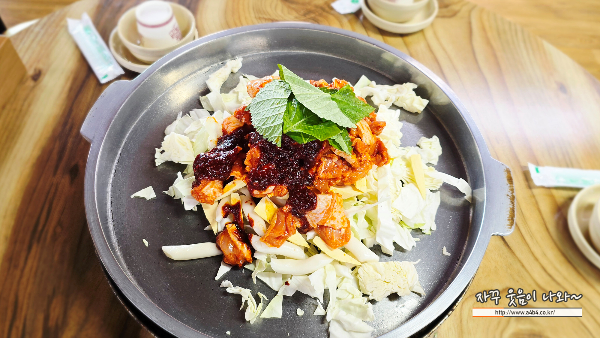 양배추와 깻잎, 떡, 매콤한 양념장이 함께 닭갈비가 나오는데요. 맵기는 일반적인 수준입니다. 아주 맵거나 그러지는 않고요.