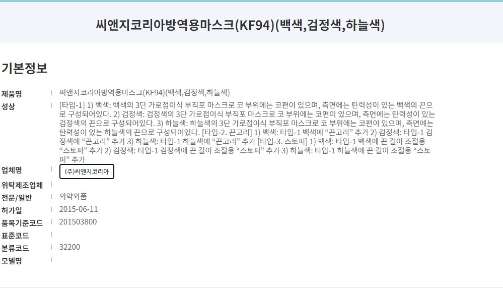 식품의약품안전처 등록 명칭은 '위드 방역용 마스크 KF94' 제품입니다. 사이즈는 대형만 있네요. 코로나19가 한창이던 작년 6월에 식약처 허가된 제품으로 마스크 제조사는 '주식회사 위드플러스' 입니다.
