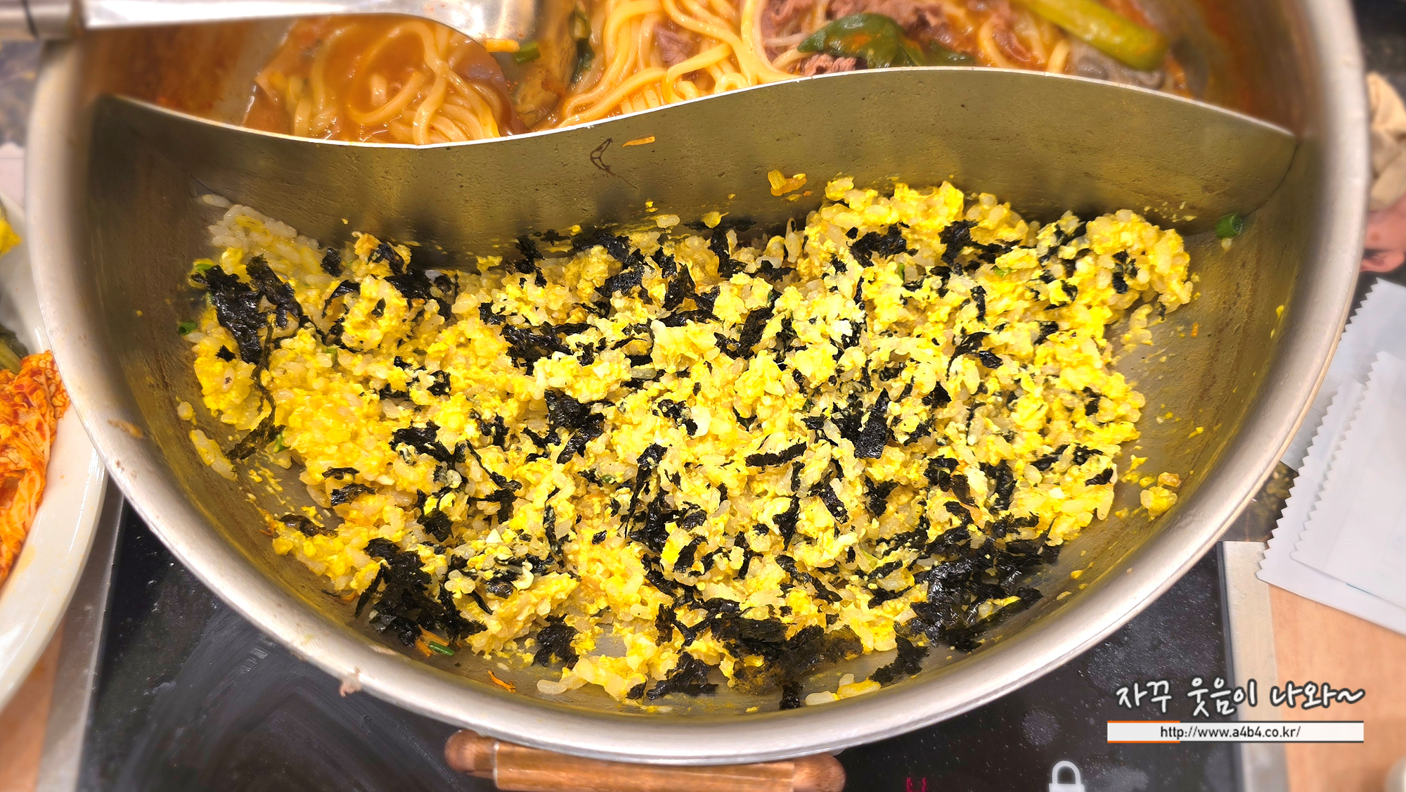 마지막에는 매운 육수에 양지고기와 함께 얼큰 칼국수를, 다른 한쪽에는 볶음밥 만들어 먹었네요.