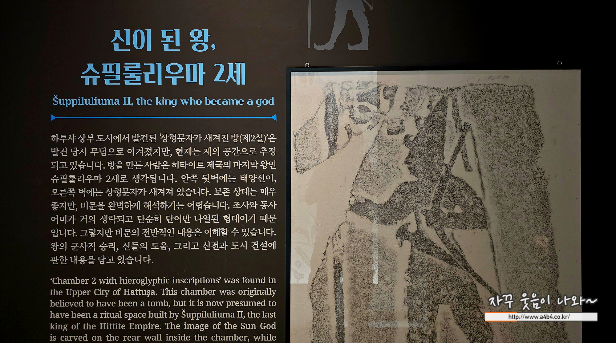 하투샤 상부 도시에서 발견된 상형문자가 새겨진방(제2실)'은 발견 당시 무덤으로 여겨졌지만, 현재는 제의 공간으로 추정 되고 있습니다. 방을 만든 사람은 히타이트 제국의 마지막 왕인 슈필룰리우마 2세로 생각됩니다. 안쪽 뒷벽에는 태양신이, 오른쪽 벽에는 상형문자가 새겨져 있습니다.
