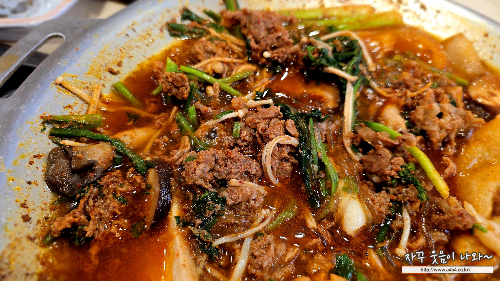삼우정 메뉴판에도 있듯 여러 불고기 메뉴중에서도 버섯불고기 이름 앞에는 매울신 (辛) 자가 써 있는데요. 저희는 다대기를 1/3 정도 덜어내고 조리해서 먹었습니다. 그래도 다소 매운맛이 느껴지네요. 아주 매콤한 불고기 전골을 기대하지 않으신다면, 매운 양념은 조절하면서 조리 하세요.