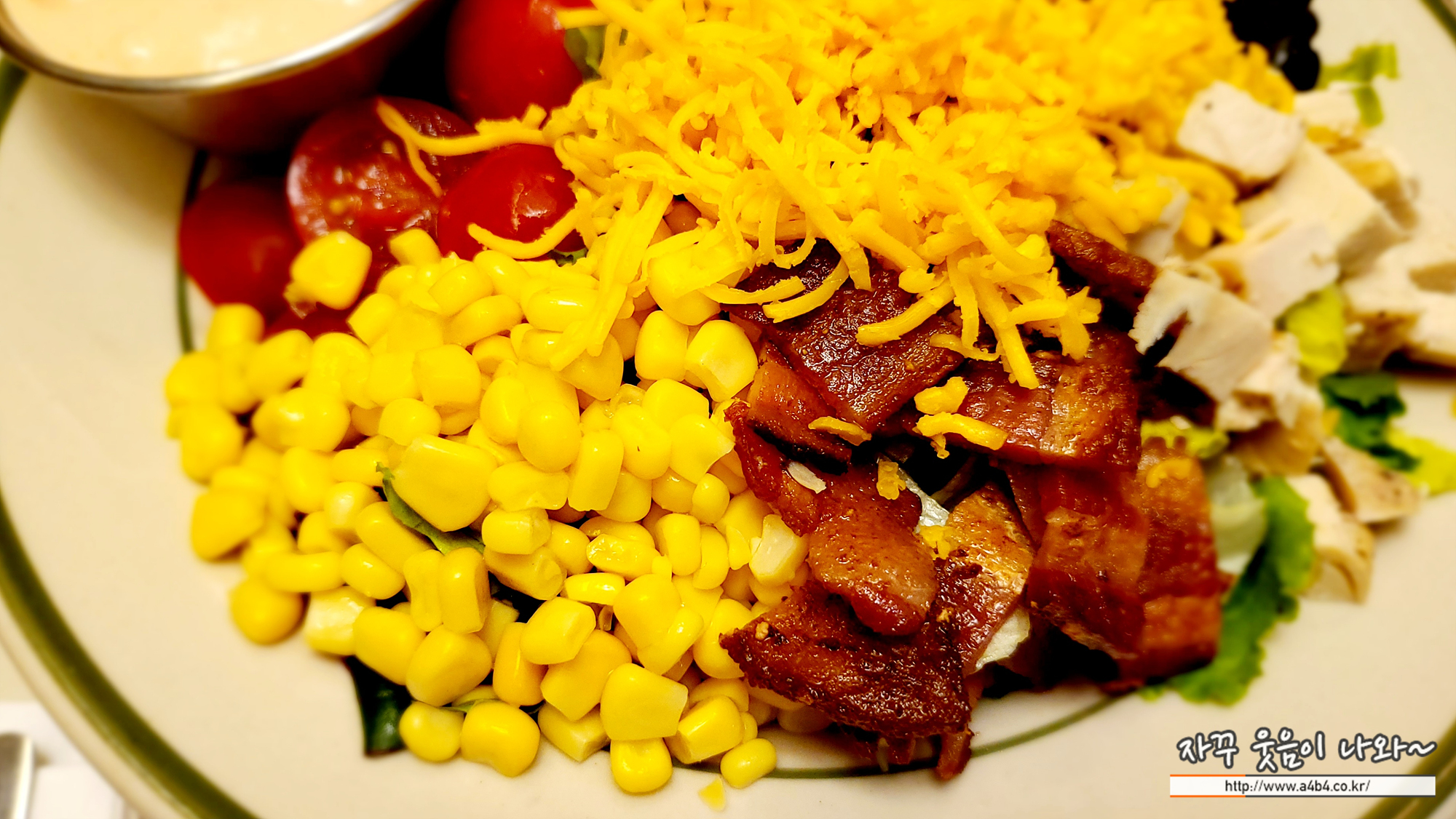 콥샐러드 안쪽에는 양상추 등 신선한 야채가 들어 있습니다. 여기네 홈메이드 사우전드 아일랜드 드레싱을 얹어 먹는데, 저는 드레싱을 별로 좋아하지 않아서 그냥 먹었네요. 그래도 맛있게 잘 먹었다는...