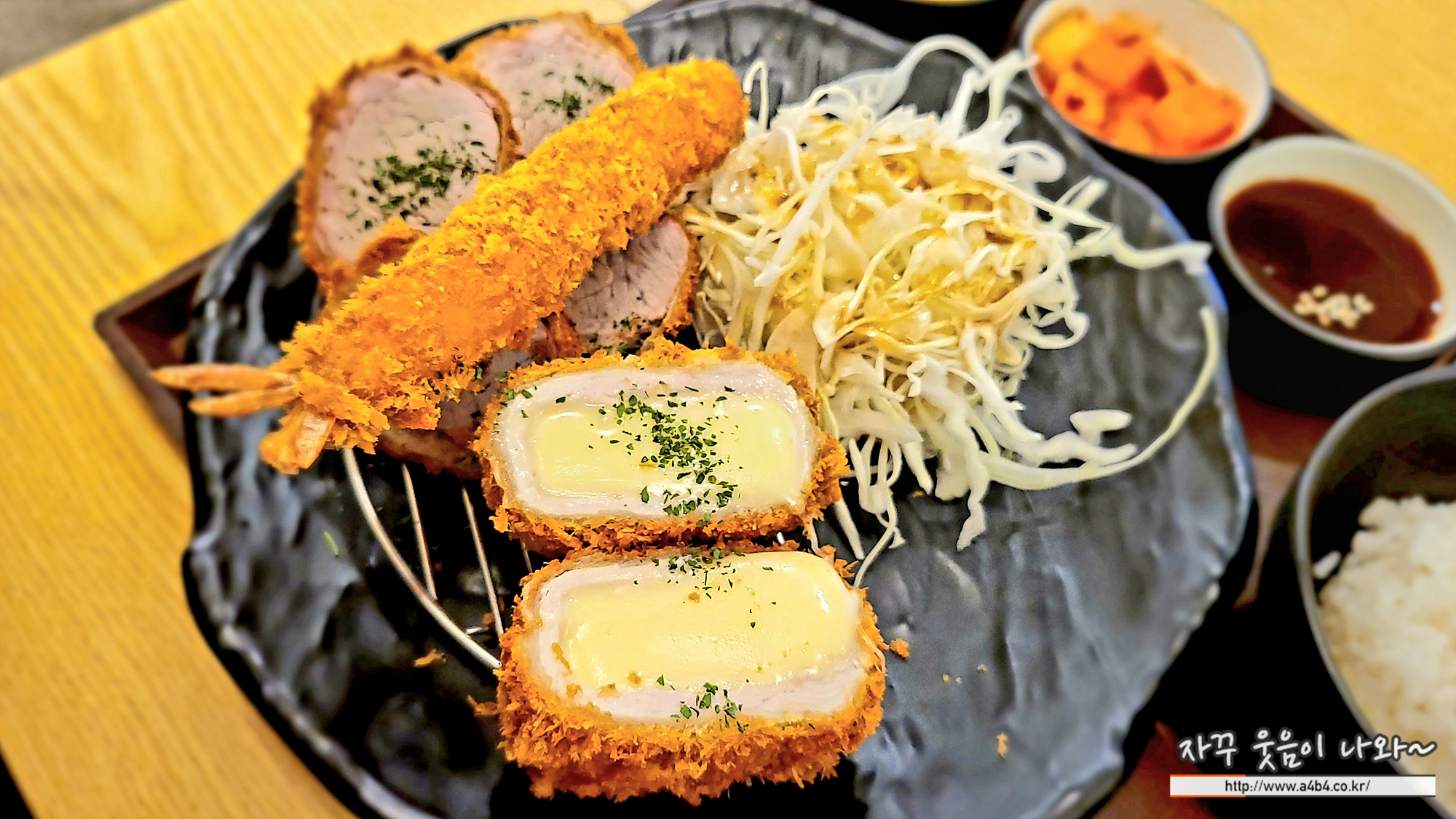 안심까스와 치즈까스, 새우튀김과 냉소바가 같이 나오는 세트메뉴 입니다.