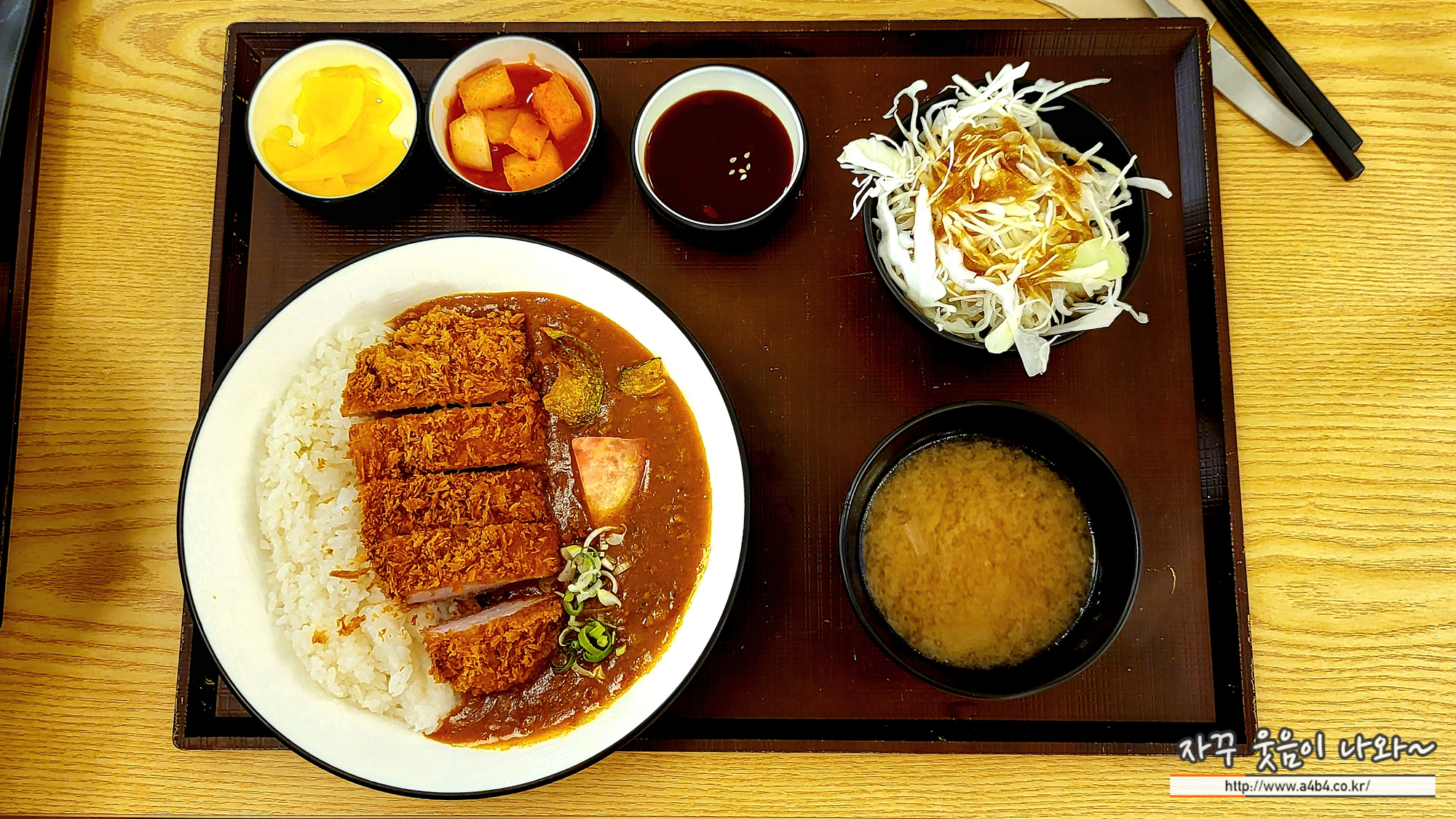 밥 많이, 등심카스 많이, 양배추 샐러드도 많이, 장국이 나옵니다.