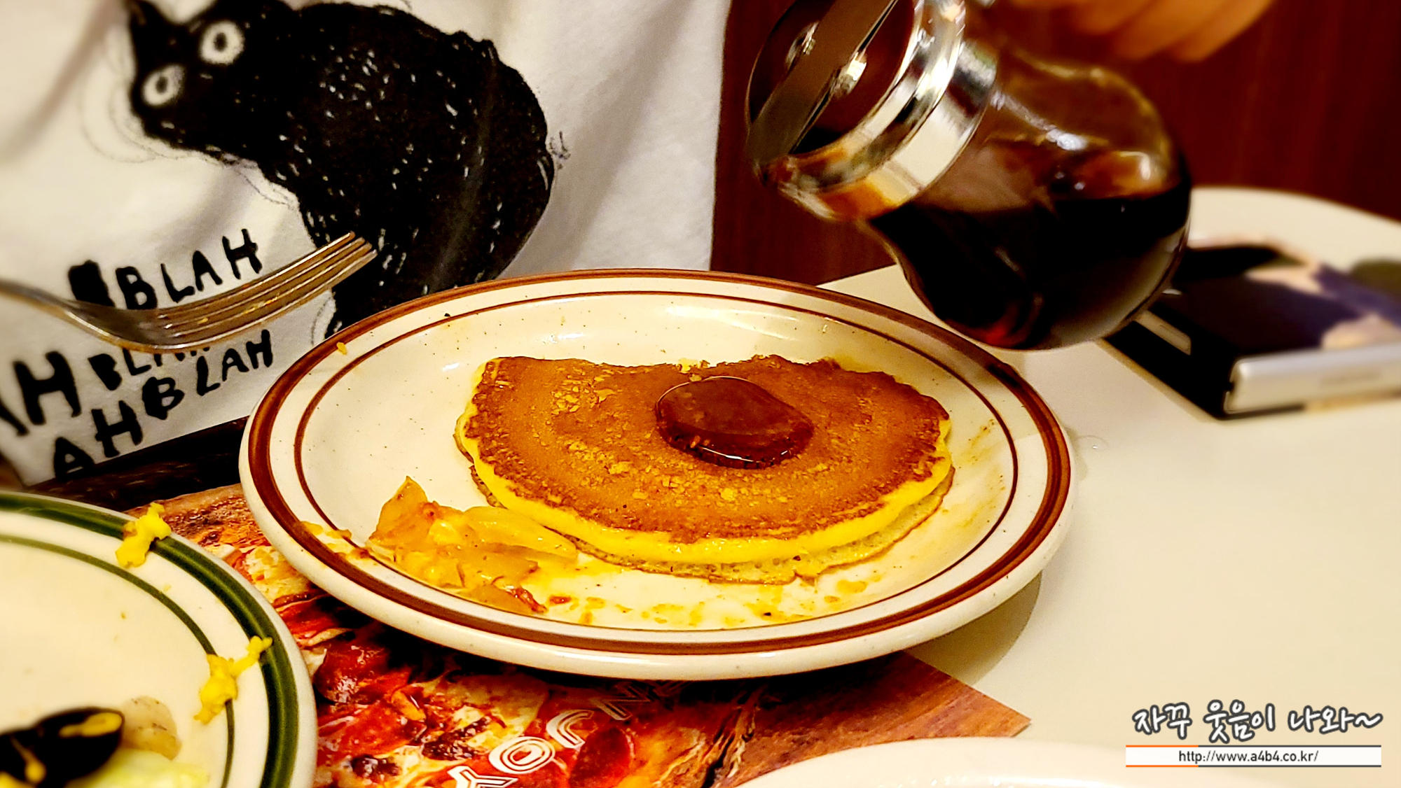 역시나 해당 메뉴에도 버터밀크 팬케이크 3장이 나옵니다. (커피를 안 먹을 수 없다는...)
