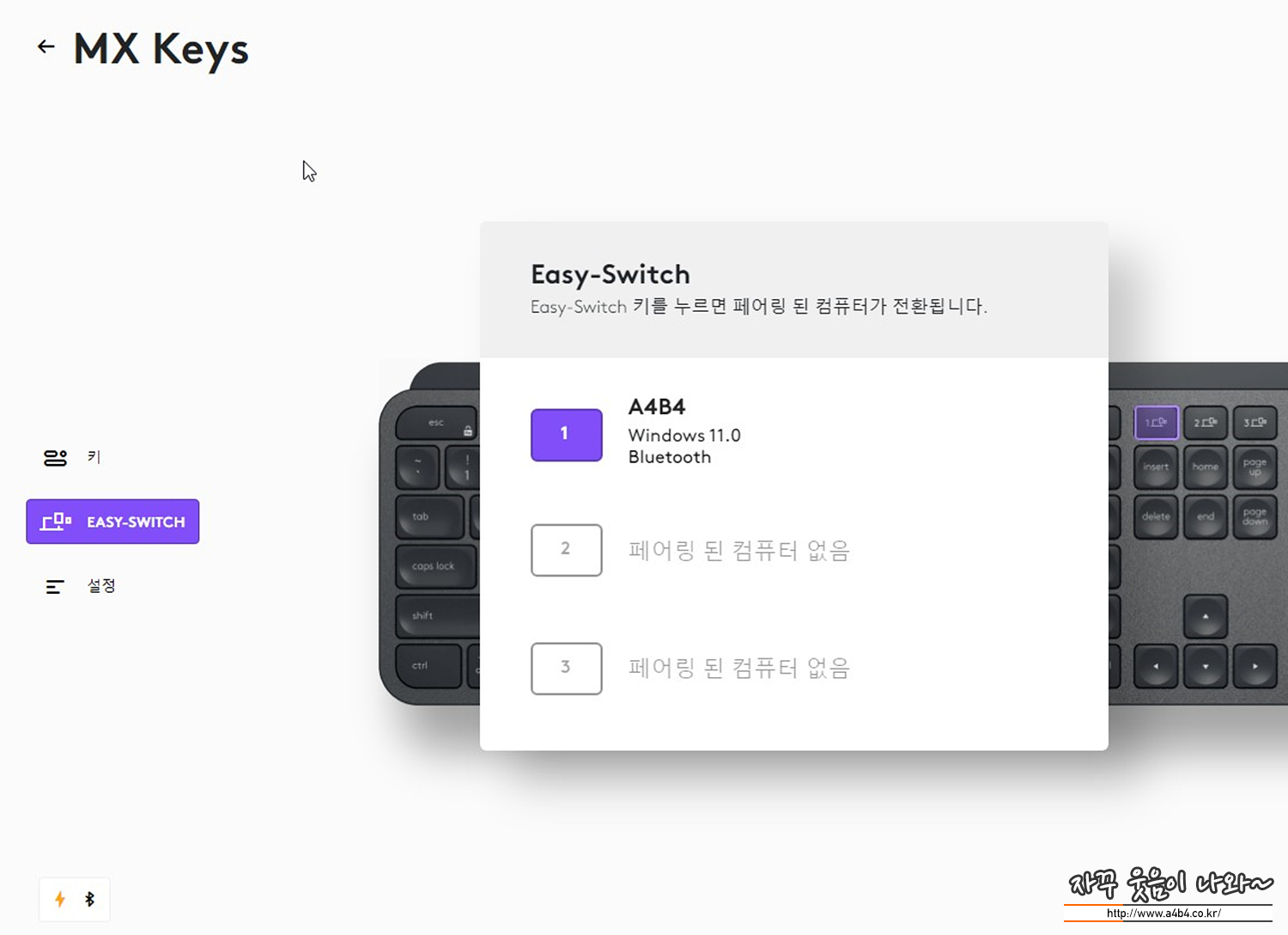 MX KEYS 로지텍 키보드 장점 중 하나는 이렇게 3개의 기기간 연결 및 전환이 쉽게 별도의 키가 생성되어 있습니다.