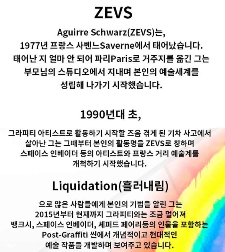 제우스는 프랑스 사벤느 출신으로 파리에서 성장했다고 합니다. 1990년 초 그래피티 아티스트로 활동 중 기차 사고를 겪게 되고 이후 본인의 활동명을 ZEUS 제우스로 칭하고 작품활동을 계속하고 있습니다.