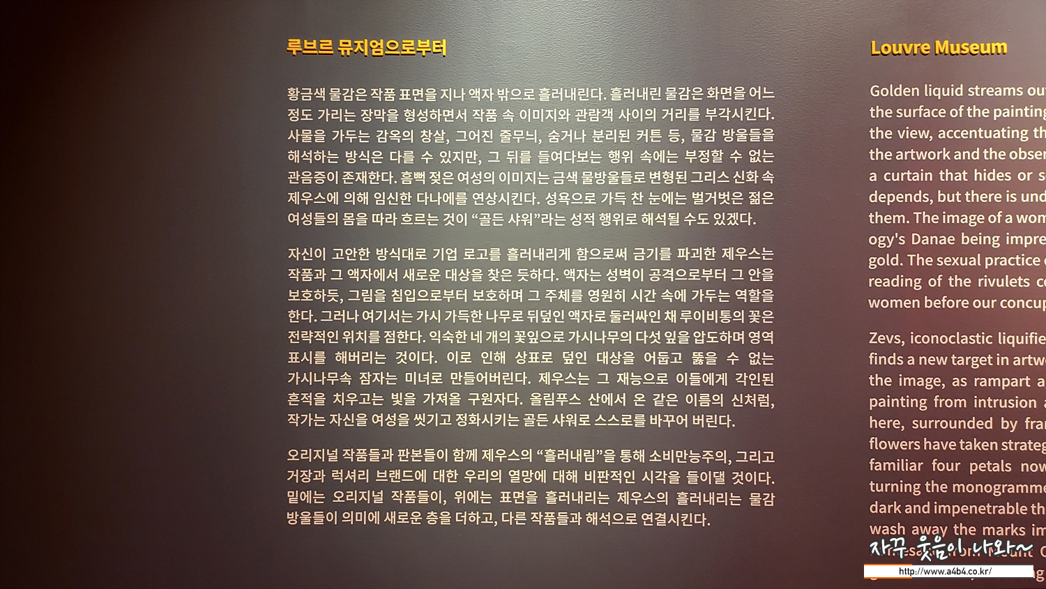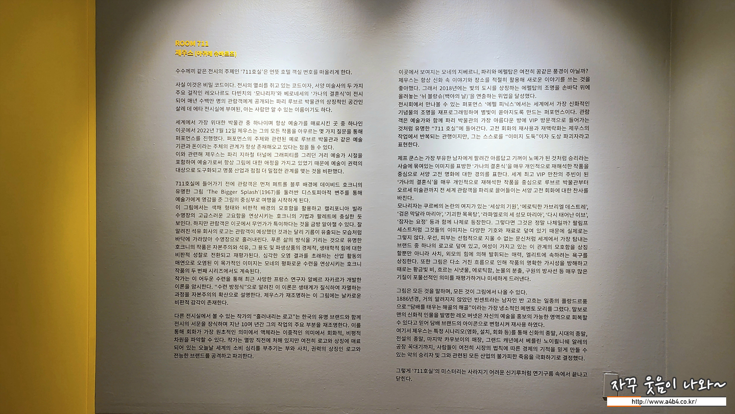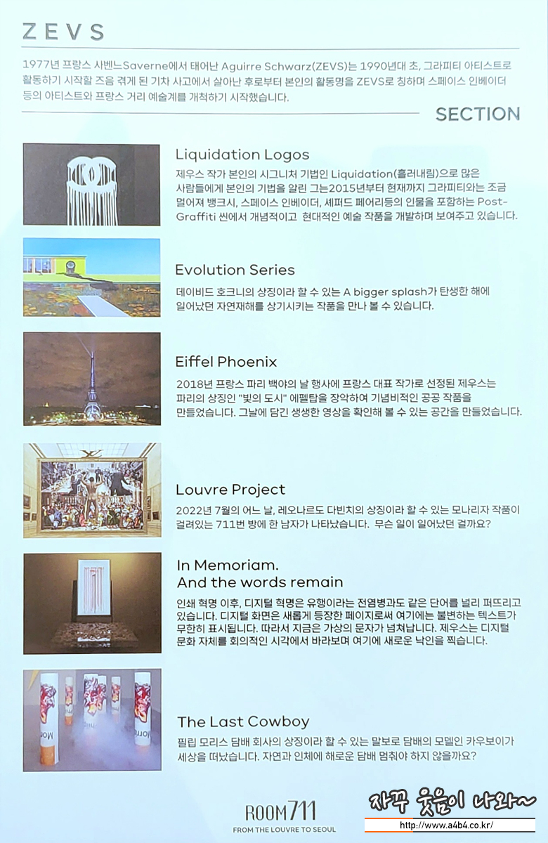 예술의 전당 한가람미술관에서 열리고 있는 세계적인 그래피티 작가이자 흘러내림 (Liquidation) 기법으로 독창적인 작품세계를 선보이고 있는 제우스 (ZEVS) 전시회인 '룸 711 (Room 711) 전시회' 관람후기 입니다.