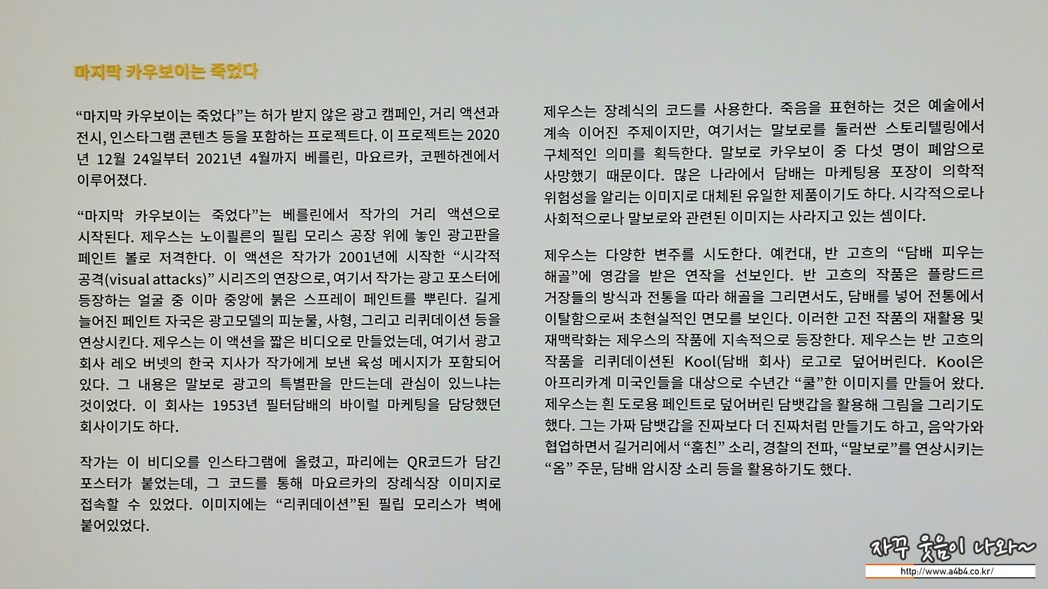 필립모리스 담배 회사의 상징이라 할 수 잇는 말보로 담배의 모델인 카우보이, 이중 6명의 모델이 폐암으로 사망했다고 합니다. 이에 대한 제우스 작가의 메시지