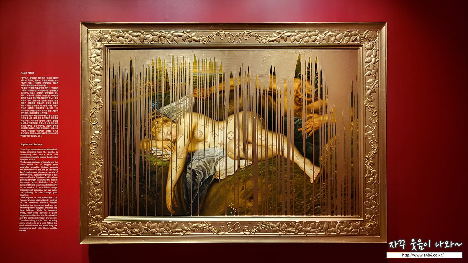 앵그르의 목욕하는 여인에서는 거의 눈에 띄지않는 작은 물줄기가 여인의 발 왼쪽에서 뿜어져 나오지만, 제우스는 수문을 열고, 그의 페인트를 흘러내리며 앵그르의. 매끄럽고 세련된 우주를 방해한다. 그림 위로 흘러내리는 금은 더 어듭고 더 피비린내 나는 무언가를 암시한다. 이 밀폐된 공간에서 아마도 무슨 일이 일어날 것이다. 우리를 향하고 있는 여성의 등은 곧 발산될 폭력적인 충동을 숨기고 있을지도 모른다. 홀로페르네스를 유혹한 후 그의 목을 자르는 주디스일 수도 있다.
