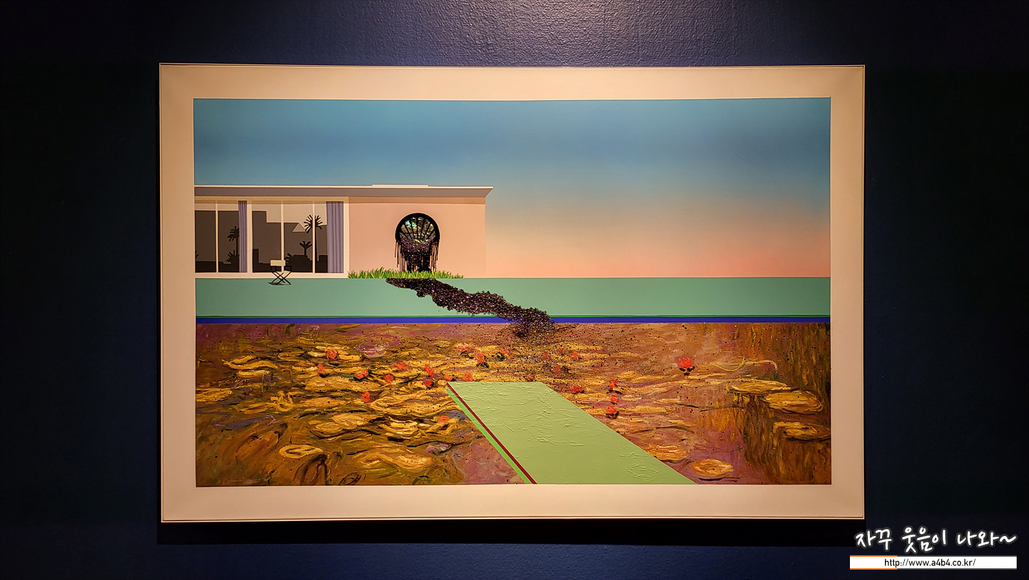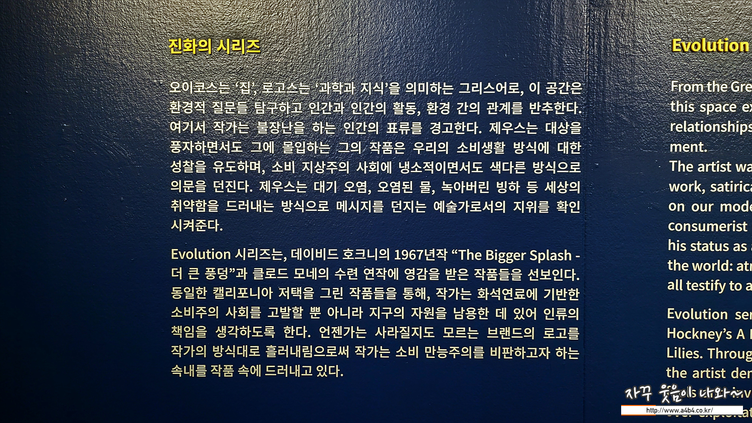 섹션 2 '진화의 시리즈'에서는 영국의 유명한 현대화가인 데이비드 호크니와 클로드 모네의 수련 작품을 차용해서 작업한 연작들이 전시되고 있습니다. 특히 글로벌 거대 정유회사로 인한 환경오염에 대한 위험성을 작품으로 전달하는...