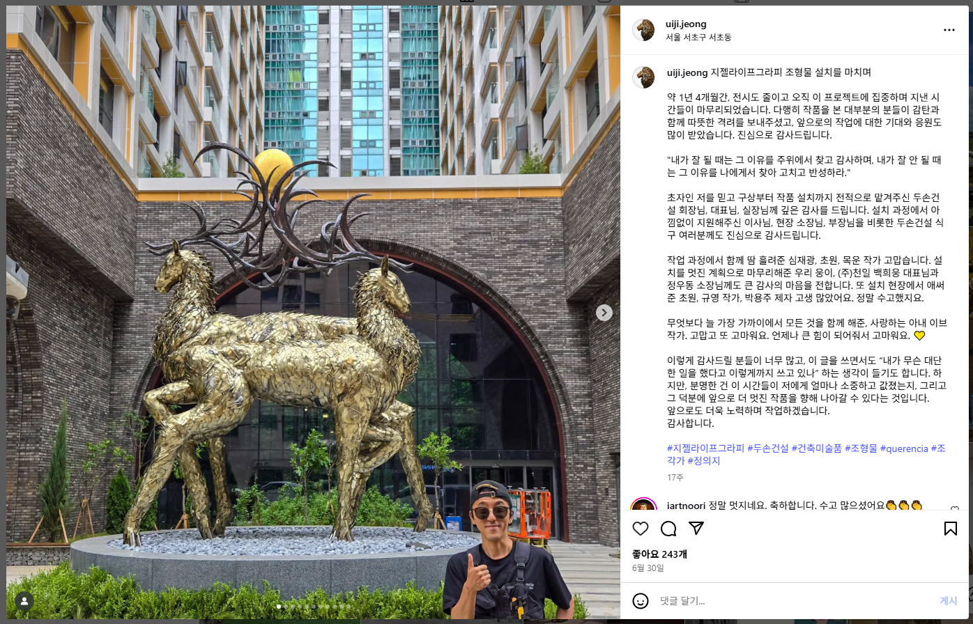 정의지 작가 작품 시리즈 중 'Querencia(안식처)'가 대표적입니다. 이 시리즈에서 작가는 ‘안식처’라는 개념을 동물 형상의 조각으로 풀어내고 있으며, 이를 통해 존재의 의미, 쓸모를 다한 것들의 가치, 소외된 것들에 대한 관심을 표현하고 있습니다.