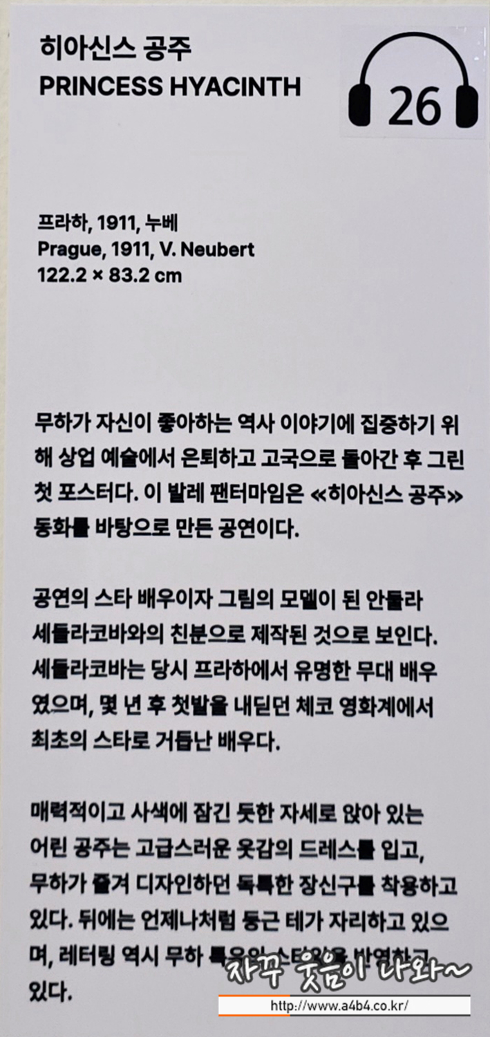 세들라코바는당시 프라하에서 유명한 무대 배우였으며,몇 년후 체코 영화계가 막 시작될 무렵,첫 스타로 자리 잡은 배우이기도 합니다. 포스터 속어린 공주는 매력적이고 사색에 잠긴 듯한 자세로 앉아 있습니다. 고급스러운 옷감으로 만든 드레스와 무하가 자주 디자인했던 독특한 장신구를 착용하고 있으며, 배경에는 무하 작품에서 늘 볼 수있는 둥근 테가 자리하고 있습니다. 또한, 포스터의 레터링 역시 무하 특유의 스타일을 그대로 보여주고 있습니다.