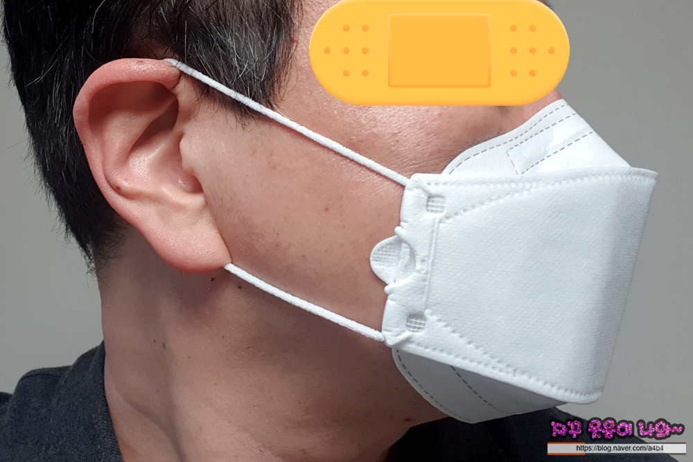 일반적인 성인에게는 상당히 만족스럽고 안정감을 주는 마스크입니다. 그러나 역시 저와 같은 대갈장군에게는 약간 아쉬운 사이즈와 착용감을 보여주는 마스크입니다. 착용시 약간 아쉬운 착용감을 보여주며, 점심 시간이 다가오니 마스크끈으로 인해 귀 뒷부분이 조금 아프네요