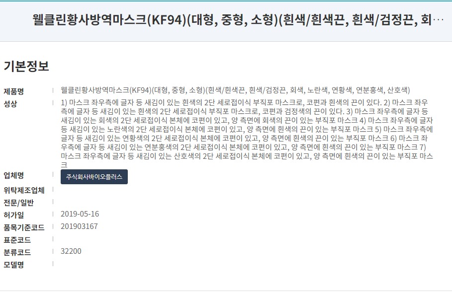 식품의약품안전처 의약품통합정보시스템 의약품제품정보 상세보기(오라클황사방역마스크(KF94)(