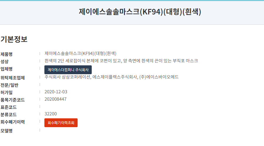 마스크 정보는 아내롸 같으며 식약처 불량마스크로 등록된 이력은 없습니다.