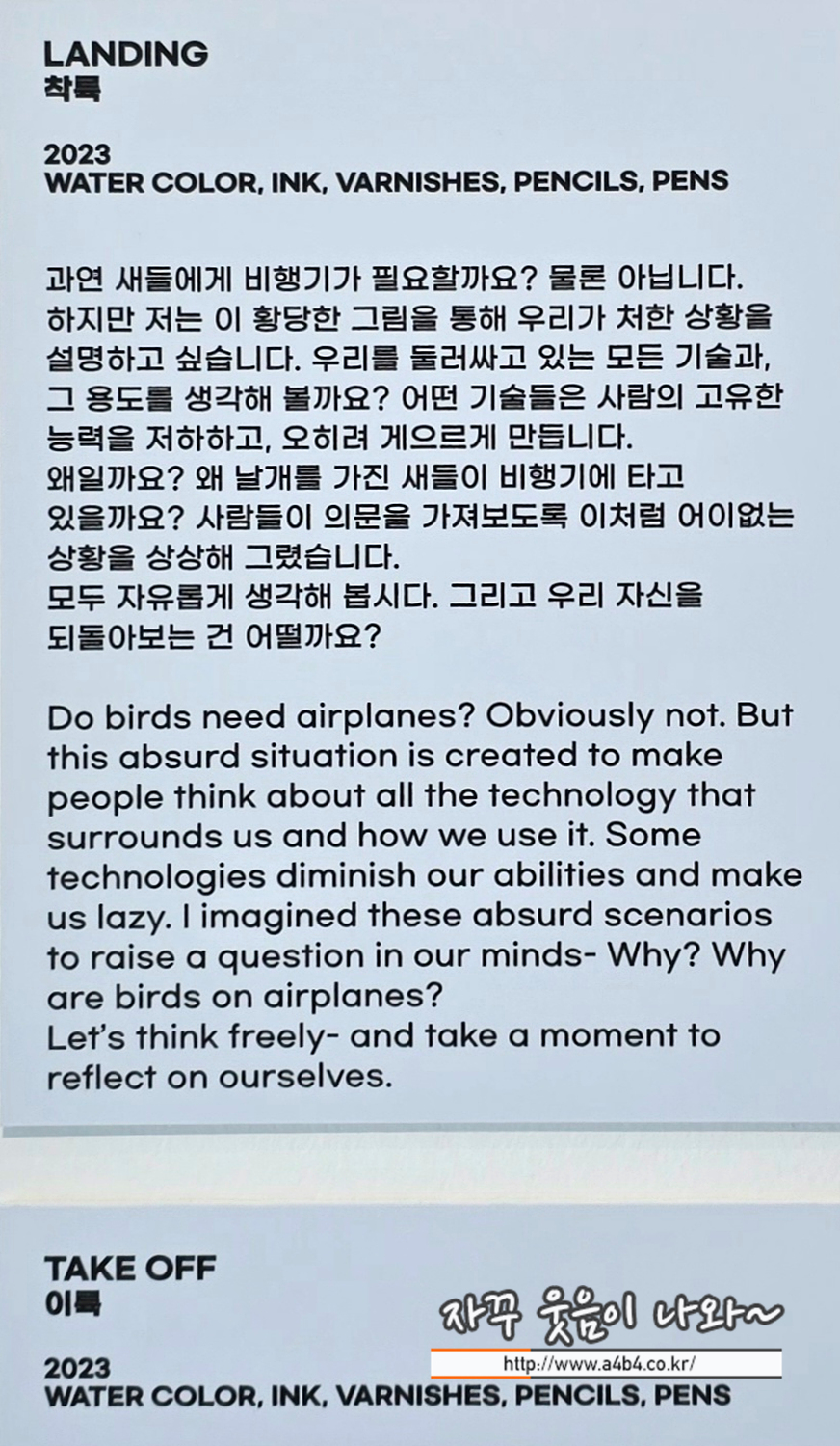두 마리의 새는 하늘을 높이 날고 있지만, 비행기에 날개가 달려있지 않은 새들은 땅에 내려앉아 있습니다. 날개 없이 어떻게 날 수 있을까? 이봐 친구, 우리에겐 이미 우리의 날개가 있어! 이 비행기에서 내려 우리만의 방법으로 날아보자. 이 이야기는 자기 인식에 바치는 경의를 표현합니다.