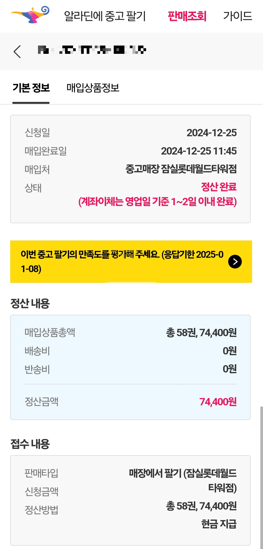 총 58권 중고서적을 판매하였고, 74,400원 받았네요. 알라딘 포인트나 현금으로 받을 수 있고요.