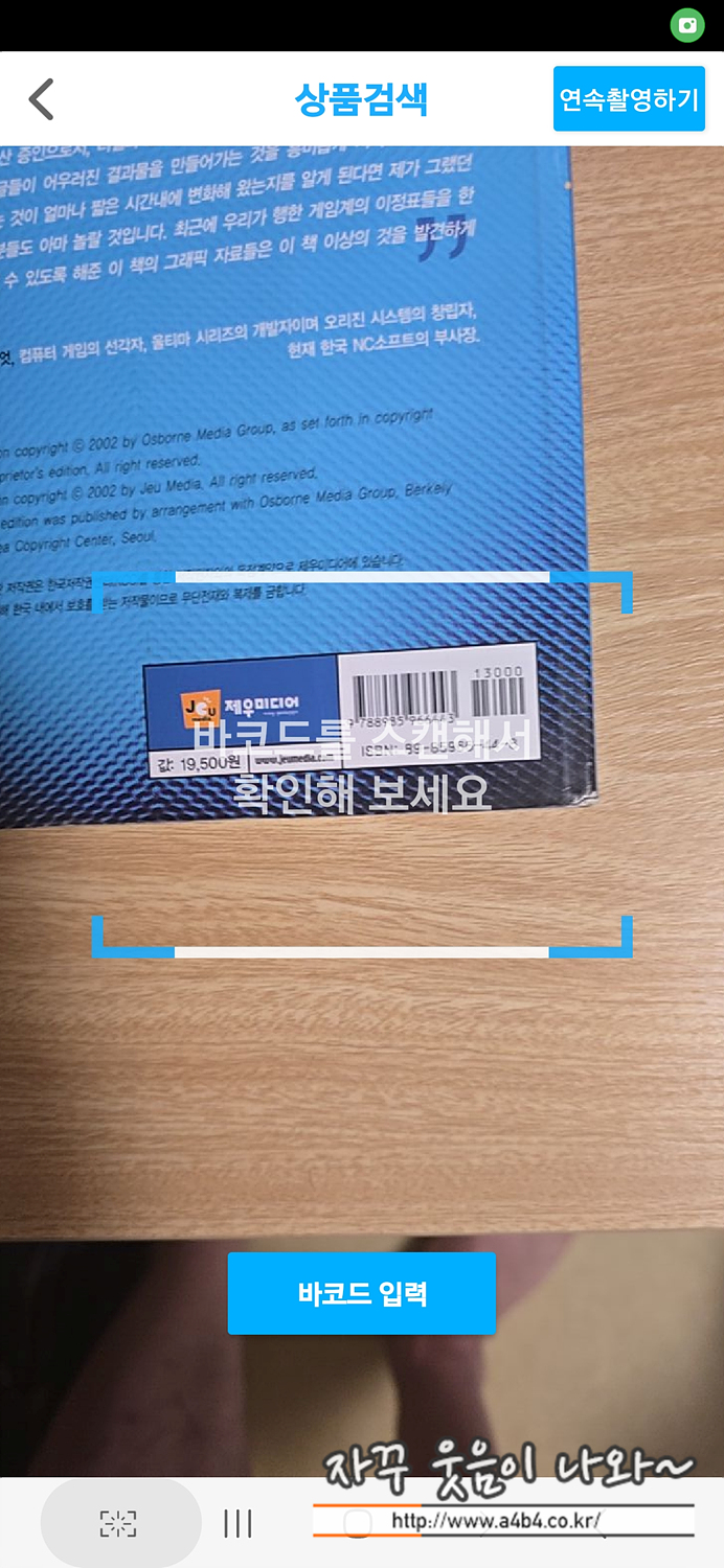 바코드 아이콘을 선택하면 마지막 이미지와 같이 바코드를 스캔할 수 있는 화면으로 전환되는데요. 여기에 보통 책 뒷면에 있는 바코드를 스캔하편 알라딘 책 판매 가능여부와 판매가를 확인할 수 있습니다.