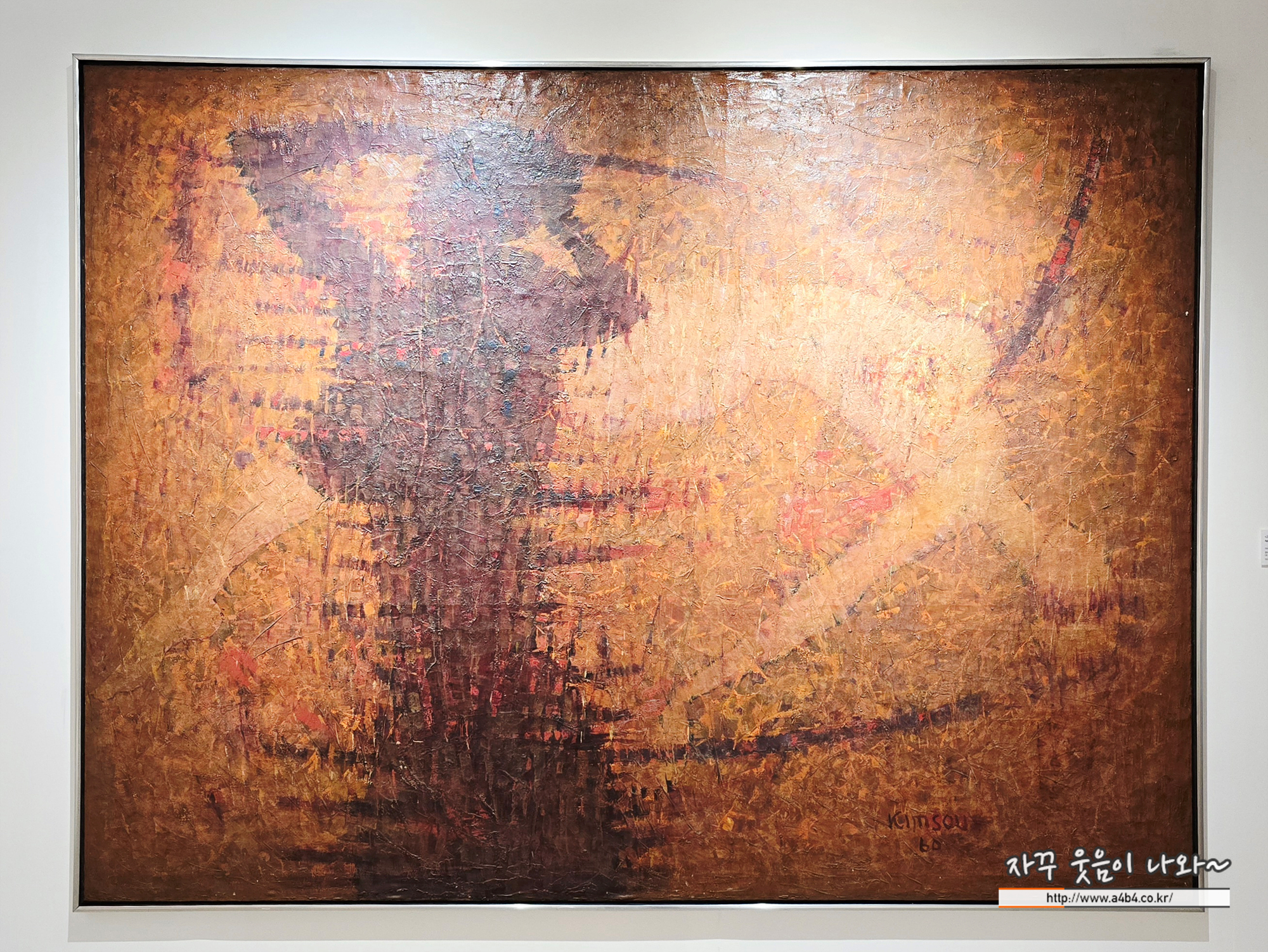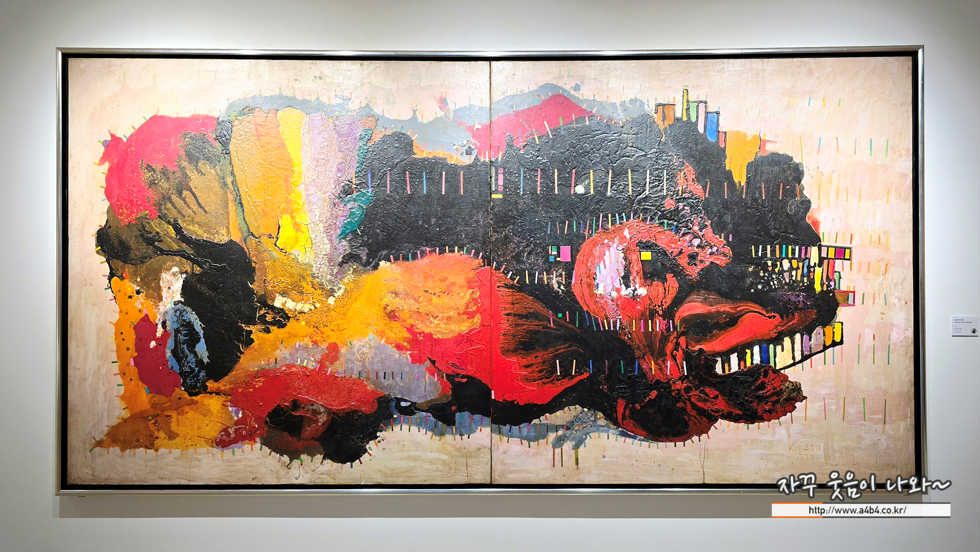 보다가 깨달음을 업으며밝은 광명을 받는 순간을 그린 그림으로, 김흥수 본인은 무교였으나 성스러움의 극치인 종 교적 순간을 잘 그려낼 경우 예술가로서의 능력이 증명된다고 생각하였다고 합니다. 마치 곰팡이가 낀 듯한 추상화면과, 빛이 뿜어져 나오는 듯한 평안한 얼굴의 붓다가 대조를 이루며 감상자들 그 순간으로 인도하는 듯.