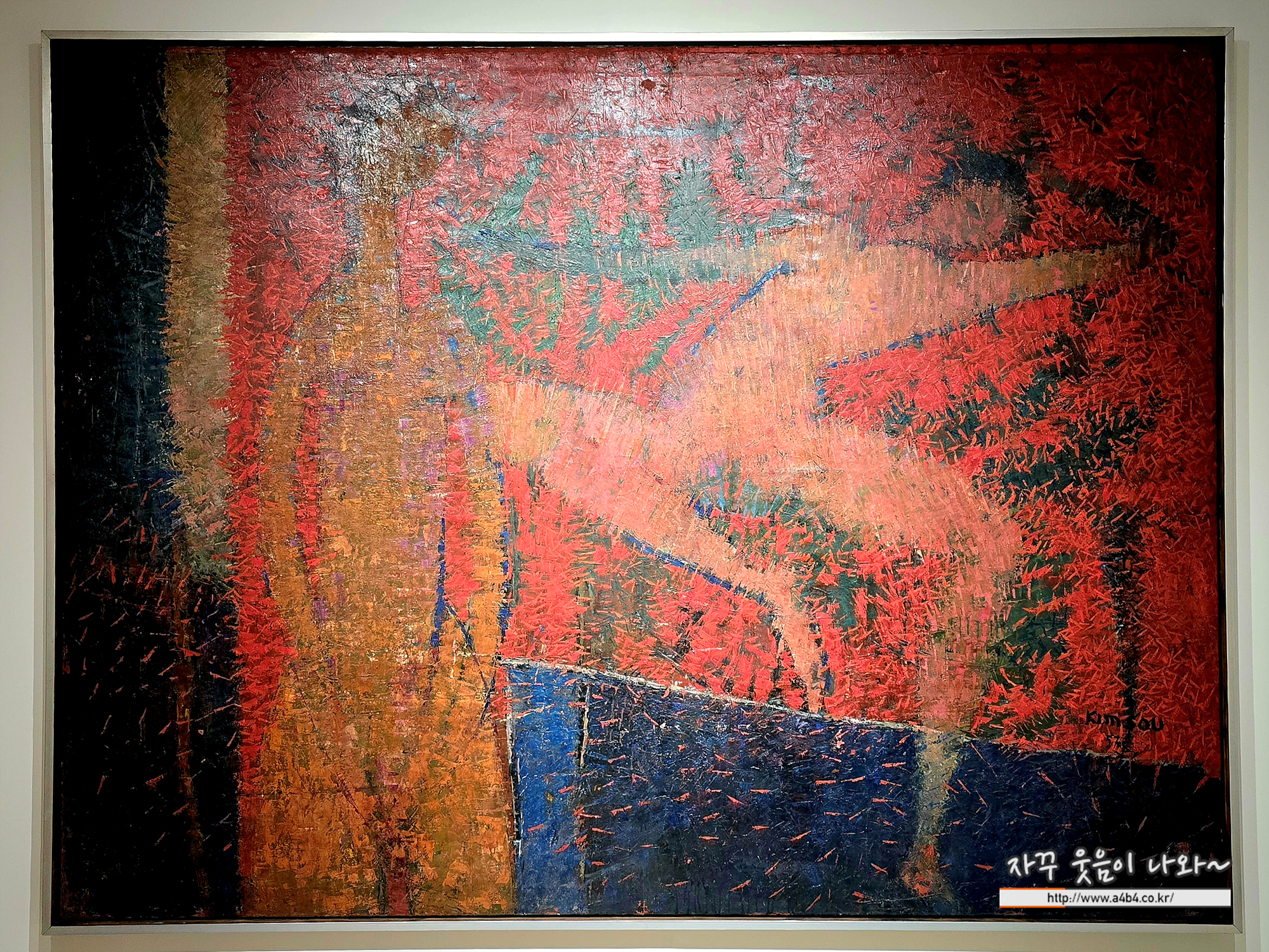 김흥수가 파리 살롱 도톤느의 정회원이 되는데 매우 중요한 계기가 된 초기작입니다. 김흥수는 파리 화단의 작품들 사이자신의 작품이 초라하고 촌스러워 실망감을 느끼고, 이후 작가는 처음부터 배우는 마음으로 다양한 화풍을 적 극적으로 받아들였으며, '콤포지션'은 그 영향이 드러나는 작품입니다. 후기의 사실적인 비밀과 달리 인체를 왜곡하여 그렸으며, 강렬한 붉은색과 거친 마띠에르는 당시 유럽을 중심으로 퍼져나갔던 앵포르멜의 영향으로 읽을 수 있습니다.