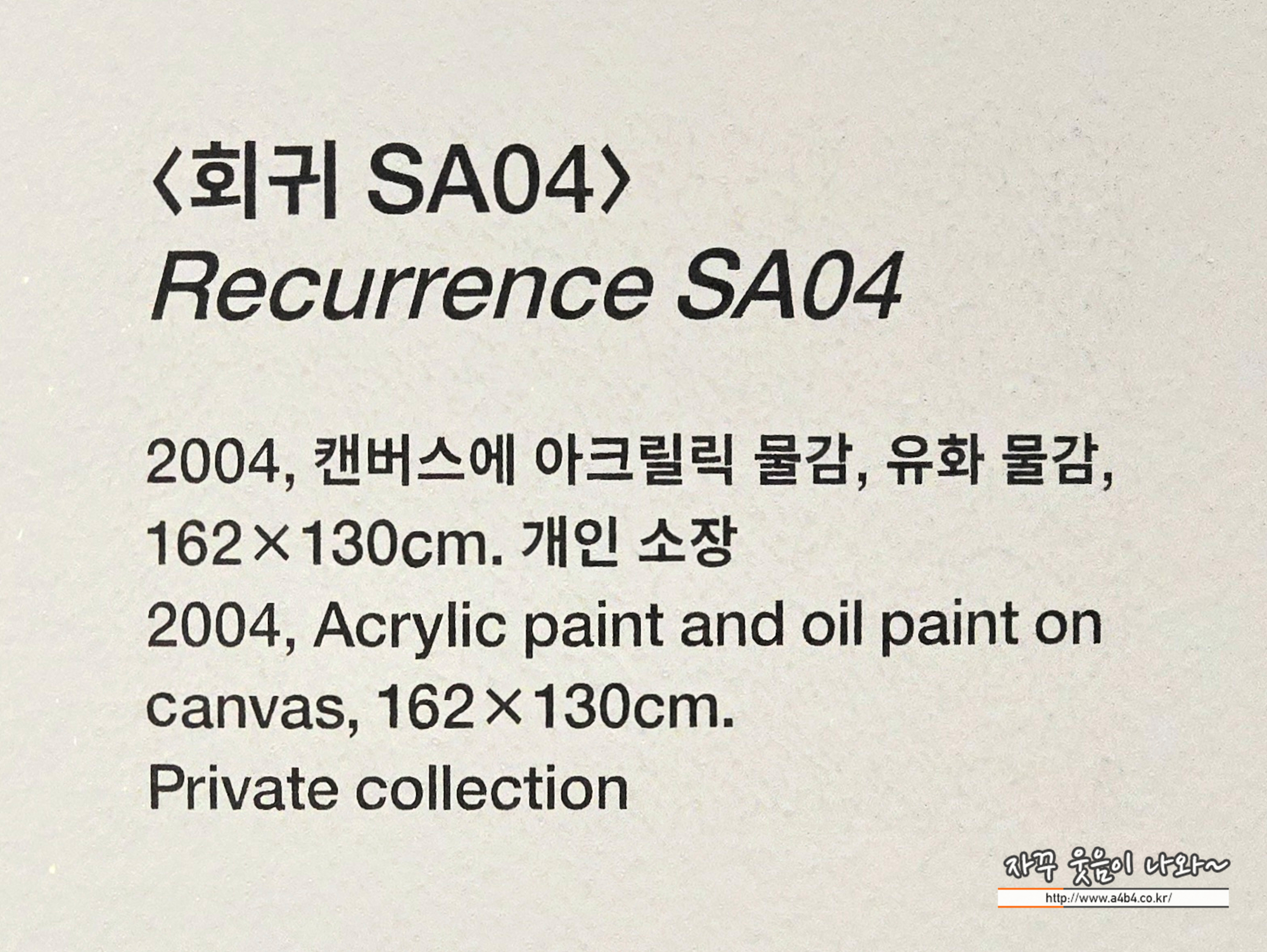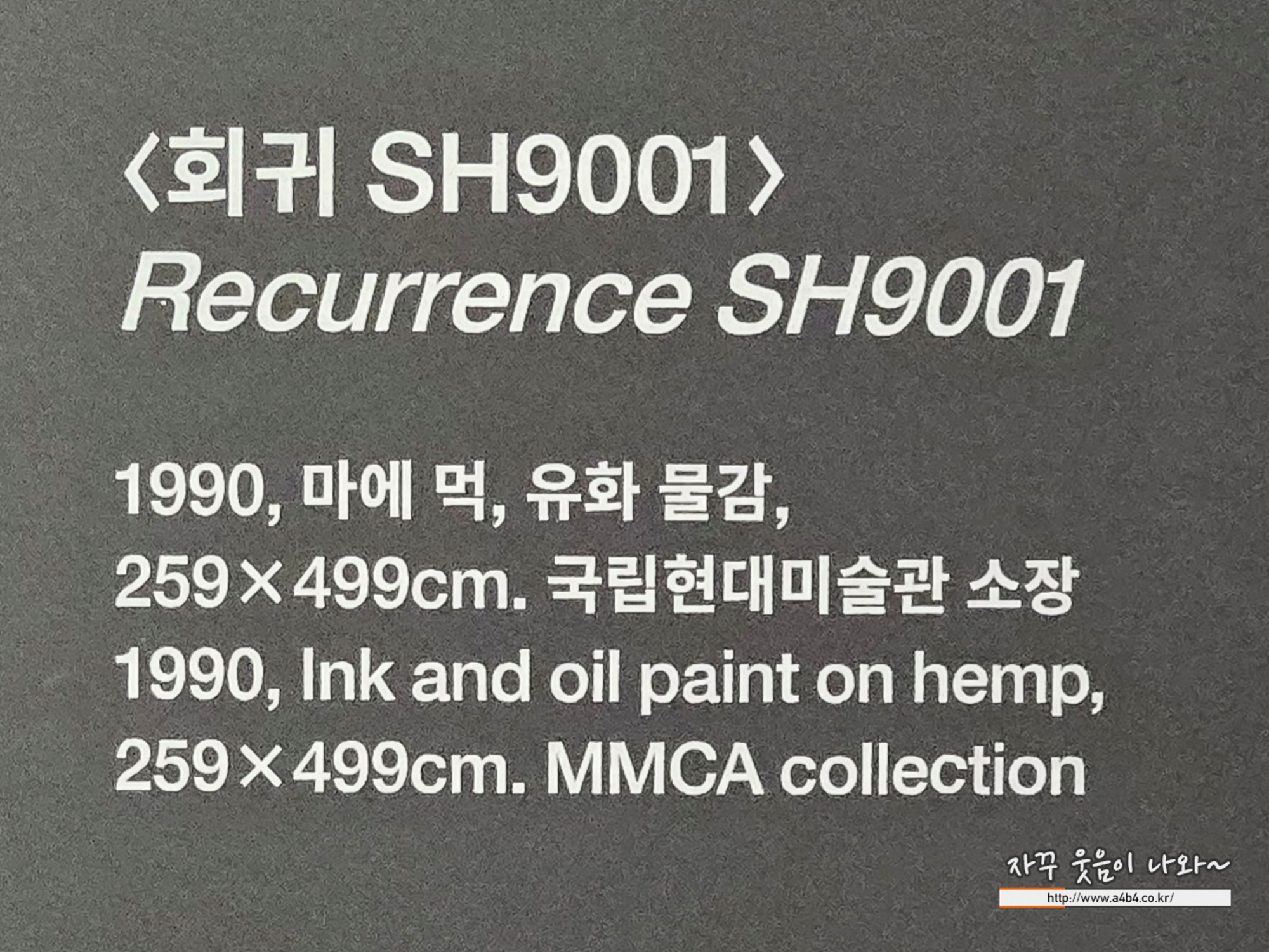그는 어린 시절 할아버지에게 배운 익숙한 글씨였기에 여러 문자 중 한자를 택했다고 설명했습니다. ‘회귀’ 연작은 자신을 성장시킨 문화권으로 되돌아간다는 의미를 담고 있습니다. 1990년대에 들어서는 천자문을 겹쳐 쓰거나 화면을 가득 채우고, 글자 크기를 확대하거나 바탕에 색을 더하는 등 구성이 변화를 보였습니다.