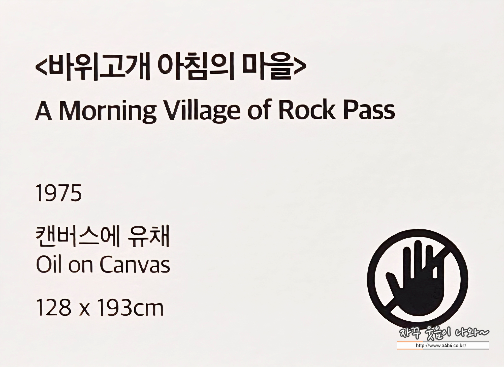 '바위고개'는 단단한 바위들 품은 산길로, 넘어야만 일상을 회복할 수 있는 경계를 의미합니다. 또한, 작가가 직접 겪은 일제강점 기시절 우리 민족의 한과 설움을 표현하는 상징적지형이기도 한데요. 다만 아침을 맞은 마을은 그 고개를 넘은 뒤, 다시 살아가는 사람들의 시간으로 읽을 수 있다. 작가는 이와 같은 정서를 추상과 반추상으로 표현하였습니다.