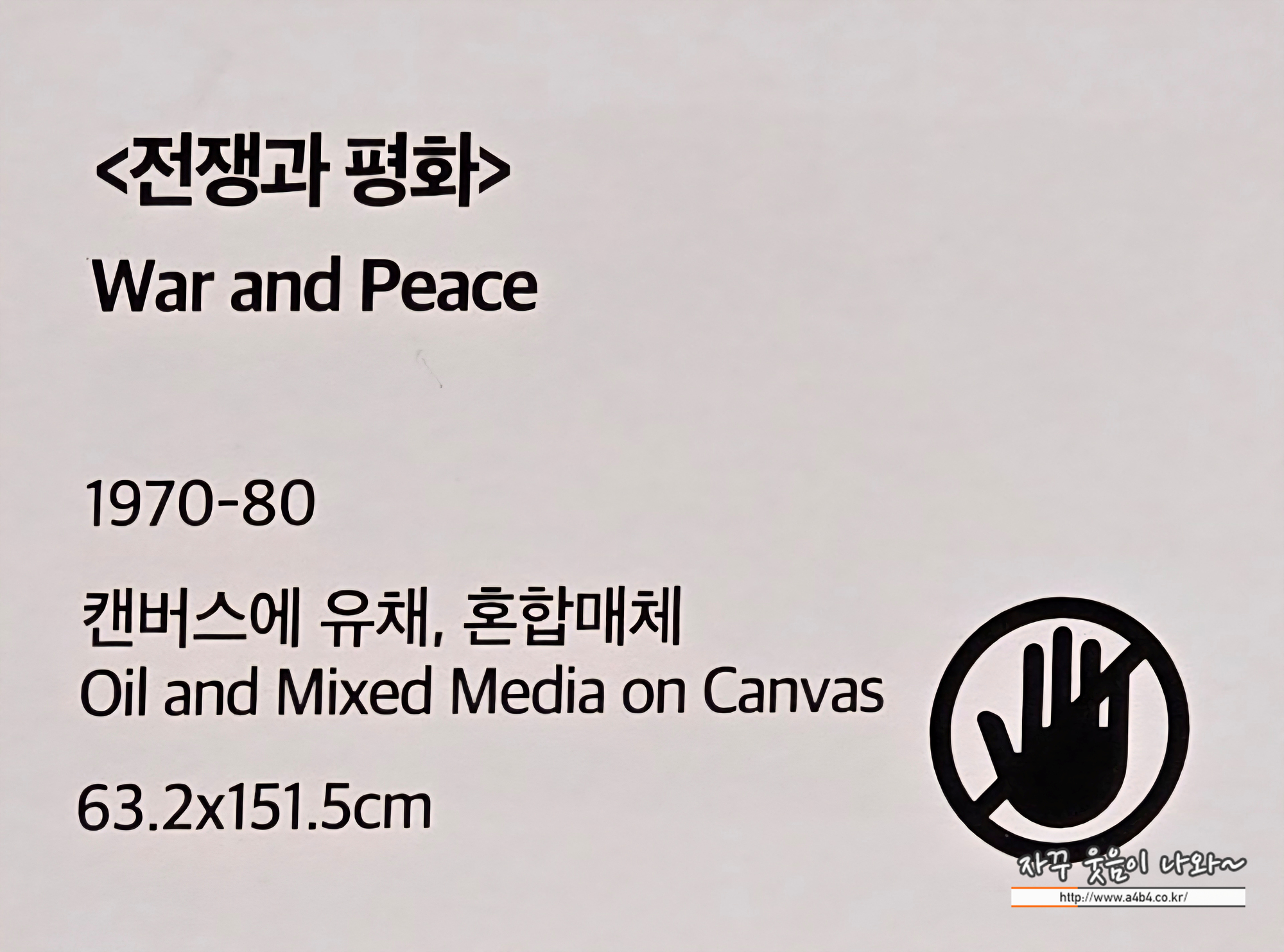김흥수 작가는 6.25 전쟁을 겪으며 재헌만으로는 이 참극을 표현할 수 없다고 느껴 구상과 추상을 한 화면에 그리 는 하모니즘 개념을 창안합니다. '전쟁과 평화'는 평화로운 품경과피난민, 군인들의 그림자를 대조적으로 그린 구상 화면의 액자식 구성과 강렬한 붉은 색채가 특징적인 작품입니다.