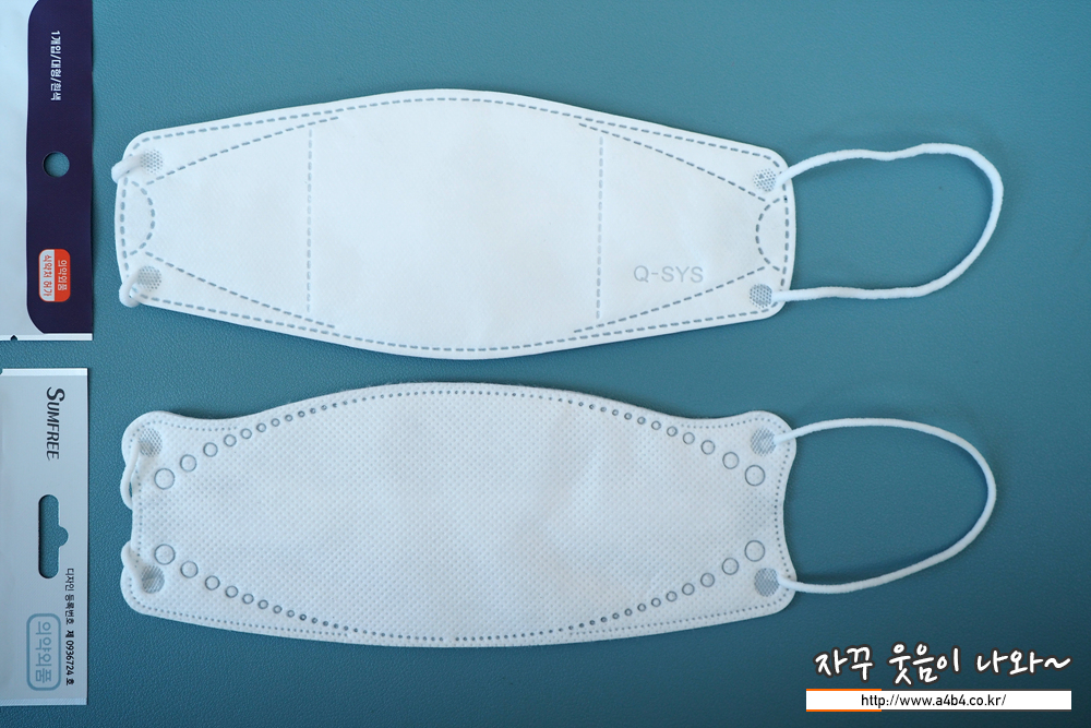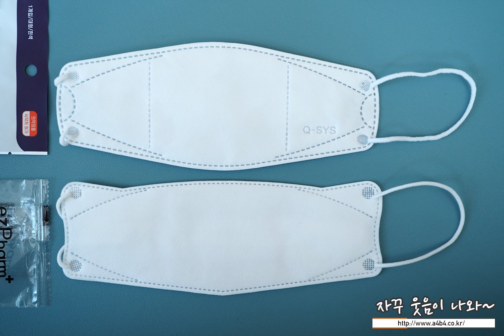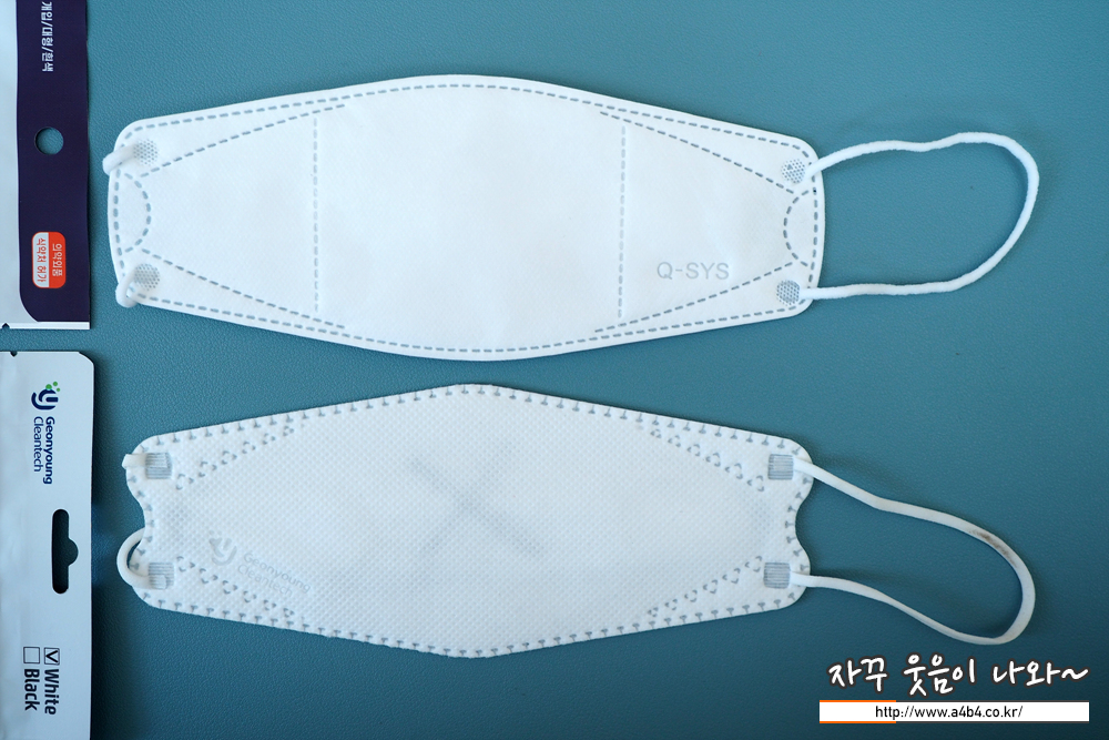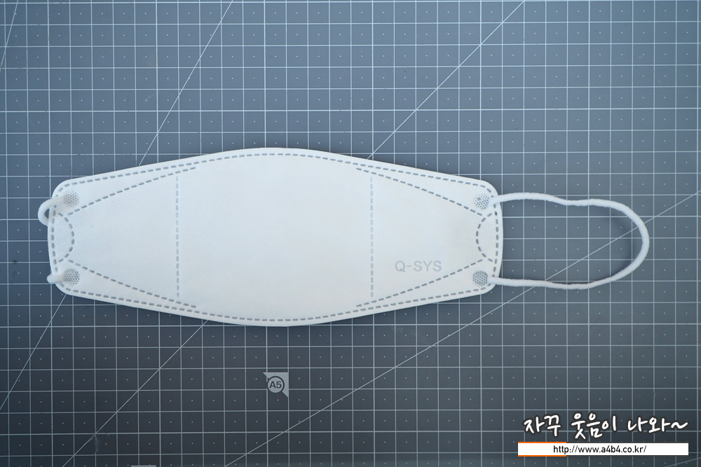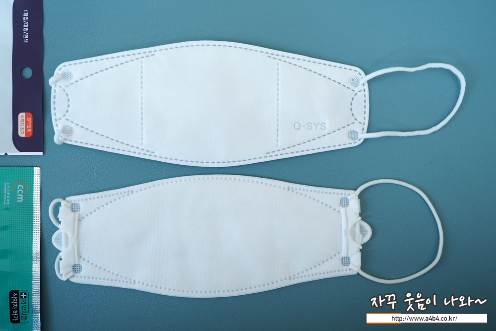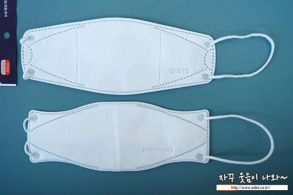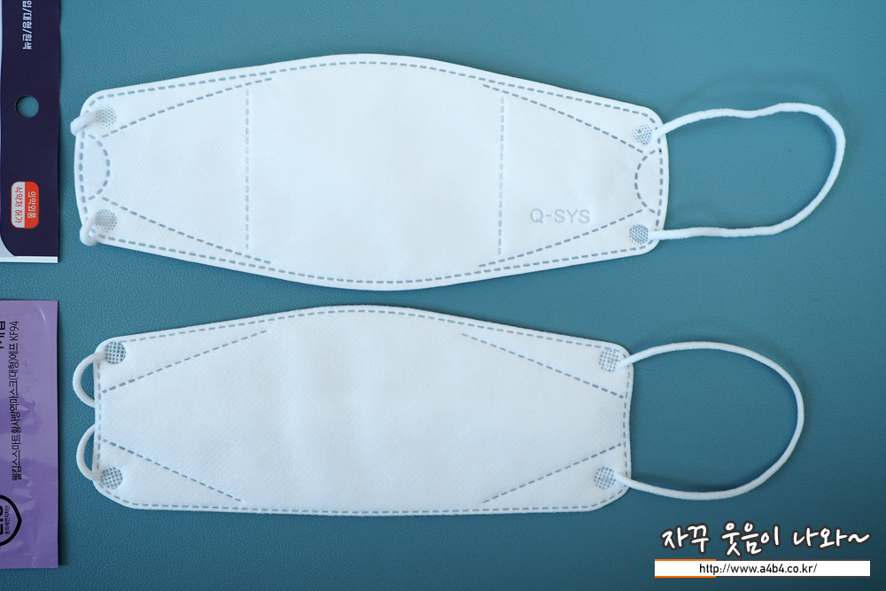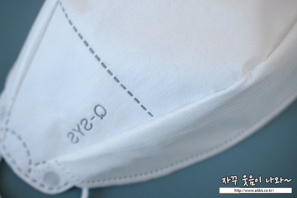 마스크 전면에는 세로 2개의 점선이 있으며, 회사명인 큐시스가 영문으로 음각되어 있습니다. 일반적인 디자인은 아닌데요. 이런 세로선 처리는 몇몇 마스크에서 볼 수 있는 디자인입니다. 기능적으로는 마스크를 3단으로 접어서 휴대하기 편하게 처리한 부분입니다. (다만 미세먼지가 아닌 코로나 예방용으로 사용하는 경우 효율성은 떨어지는 기능입니다.)