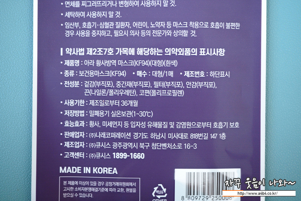Qays의 KF94 대형 '아라 황사방역 마스크' 사용기 및 리뷰 입니다.