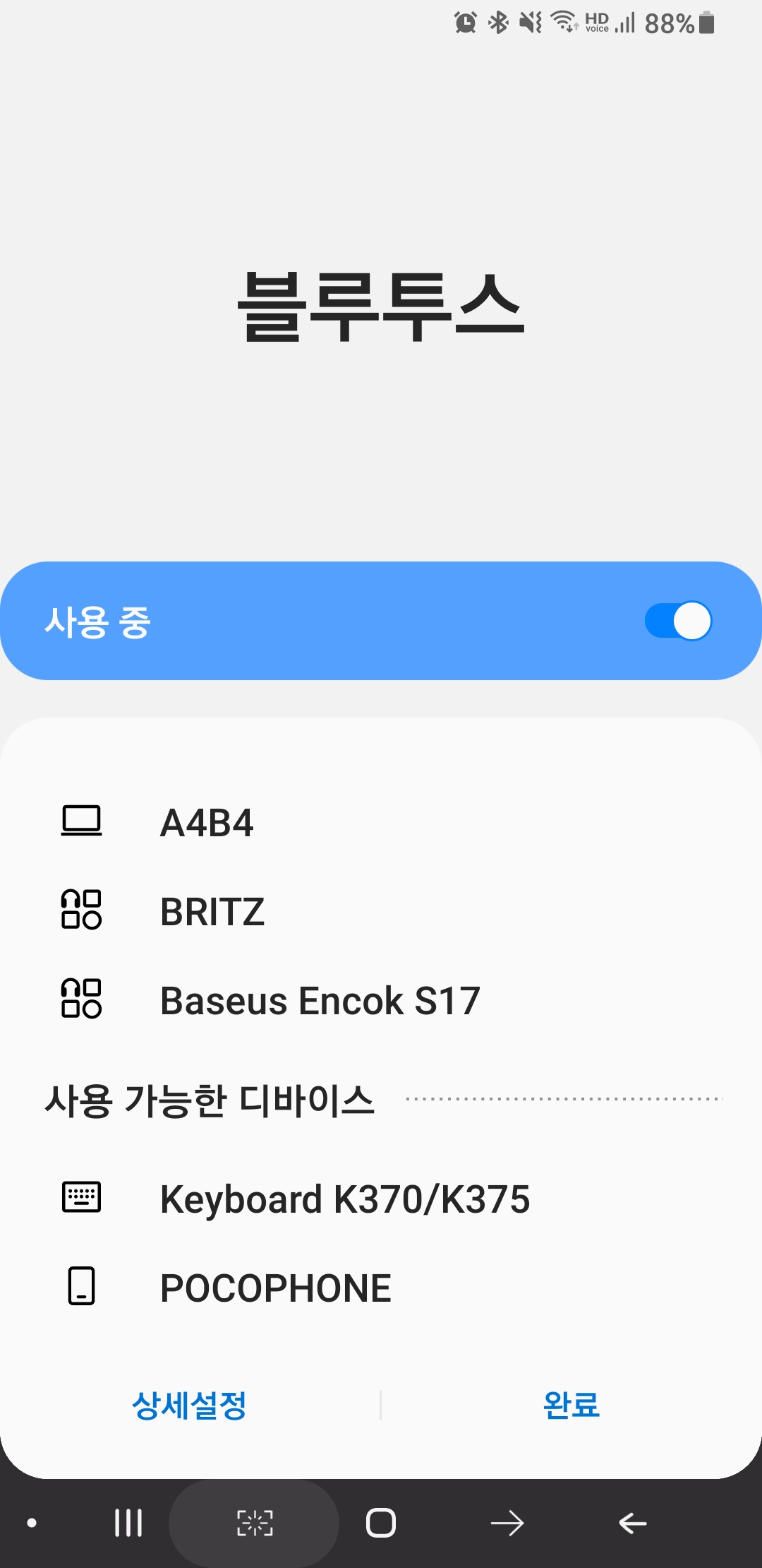이렇게 스마트 폰에 키보드 블루투스기기로 인식되고 화면에 나오는 번호 문자를 입력하면 페어링이 완료 됩니다.