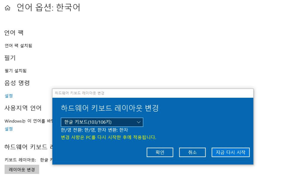 이곳에서 하드웨어 키보드 레이아웃 > 레이아웃 버튼 클릭 > 한글 키보드 101로 변경하면 로지텍 키보드 한영키로만 한글과 영어 변환이 가능합니다. 물론 한자키도 정상 작동 합니다.