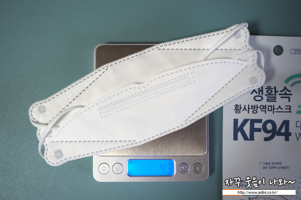 KF94 생활속 마스크 대형 중량은 4.3그램으로 타사의 대형 마스크에 비해서는 약간 가벼운 중량입니다.