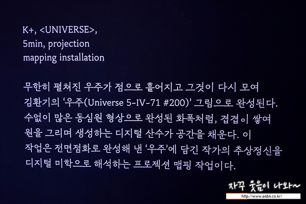 이번 김환기 화백 전시회인 UNIVERSE_WHANKI 1-I-21 LOTTE MEDIA PROJECT는 설 연휴 마지막인 2월 15일 까지 진행됩니다. 관람 시간은 대략 30분 ~ 1시간 정도 생각하시면 되며, 입장료는 없습니다.