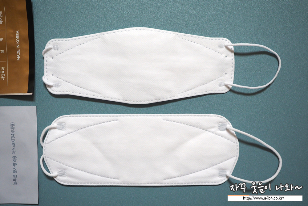 KF94 로하스 마스크 대형은 4중 필터구조의 KF94 마스크 중에서는 상대적으로 가볍고 얇은 스타일의 제품입니다. 마치 비말차단 마스크를 착용한 것 같은 착용감을 보여줍니다. 마스크에 보푸라기도 없으며, 장시간 착용해도 피부 트러블은 없습니다.
