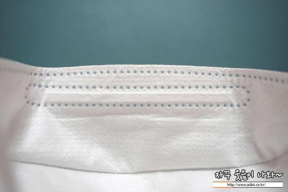 마스크 전면에 부착된 둥근 모양의 귀걸이끈 첩착은 잘 마감되어 있습니다. 귀걸이끈 탄력은 조금 강판 타입입니다.