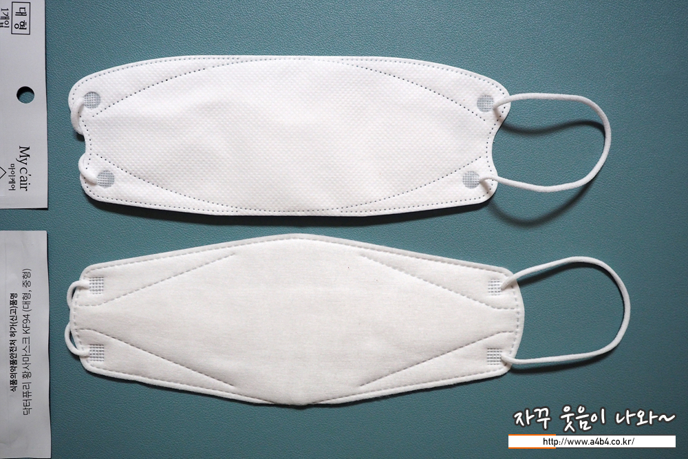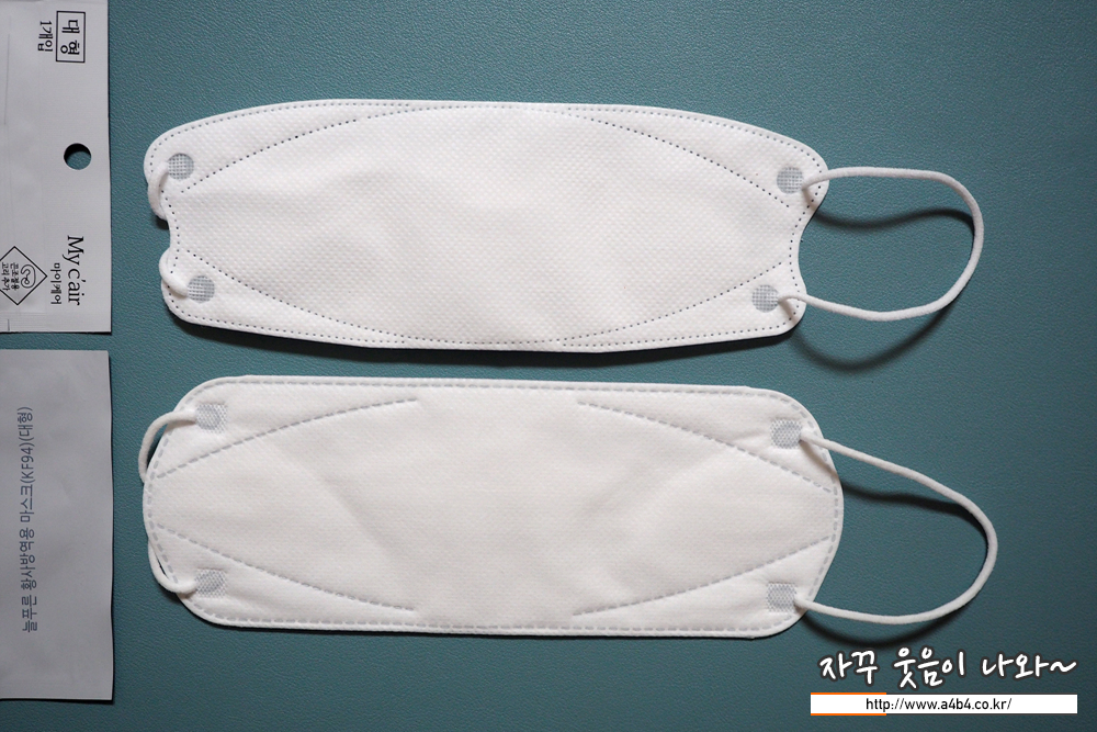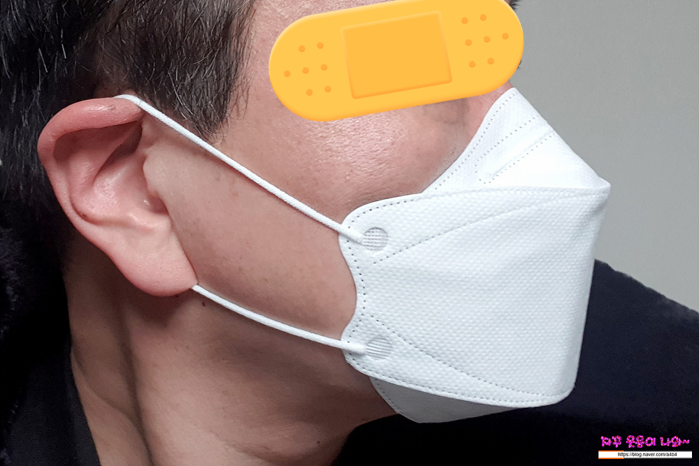 마이케어 마스크는 일반적인 대형 사이즈의 KF94 마스크입니다. 또한 타사 제품에 비해 이어밴드 길이가 상대적으로 짧고 강한 탄성을 가지고 있습니다. 얼큰이인 저는 귀가 많이 당기네요. 일반 여성분들과 얼굴 작은 남성분들에게 잘 어룰리는 제품이 아닐까 합니다. 조금이라도 얼굴이 크다면 글쎄요...