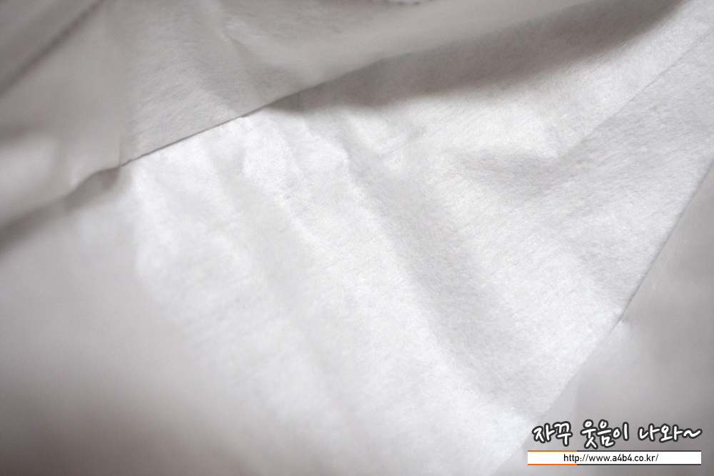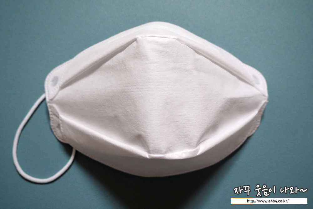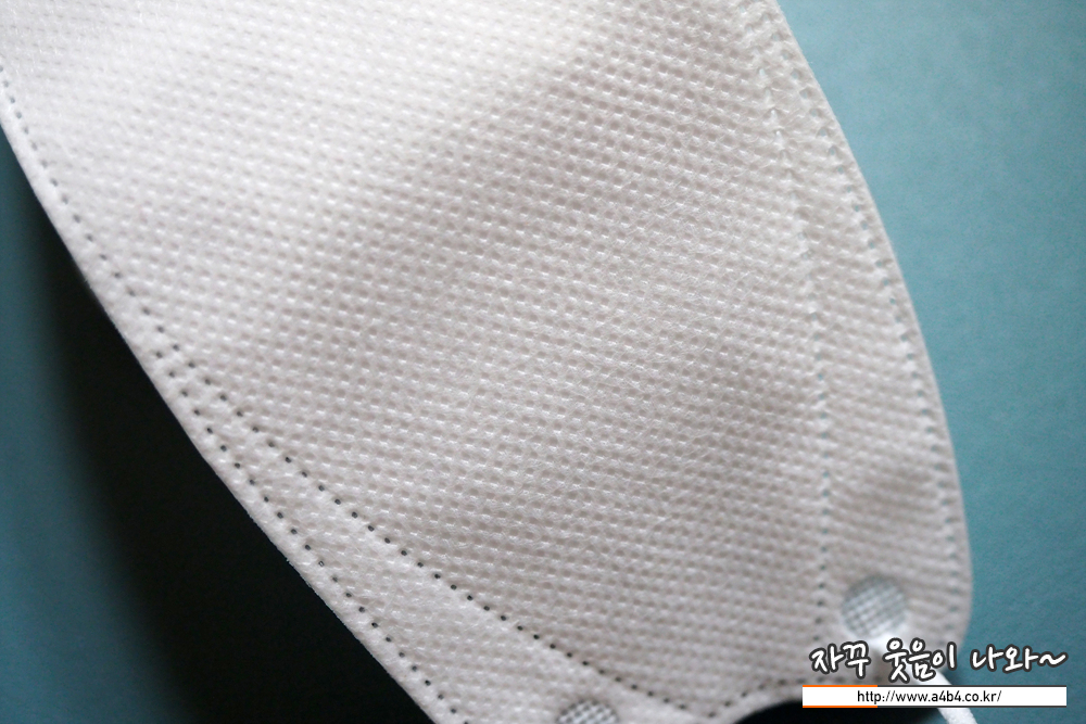 마스크 겉감은 도트 마감된 드라이한 감촉의 부직포가 사용되었습니다. 일반적인 수준의 두께감을 보여주며 마스크 착용감은 하드한 타입으로 착용핏이 잘 나오는 제품입니다.